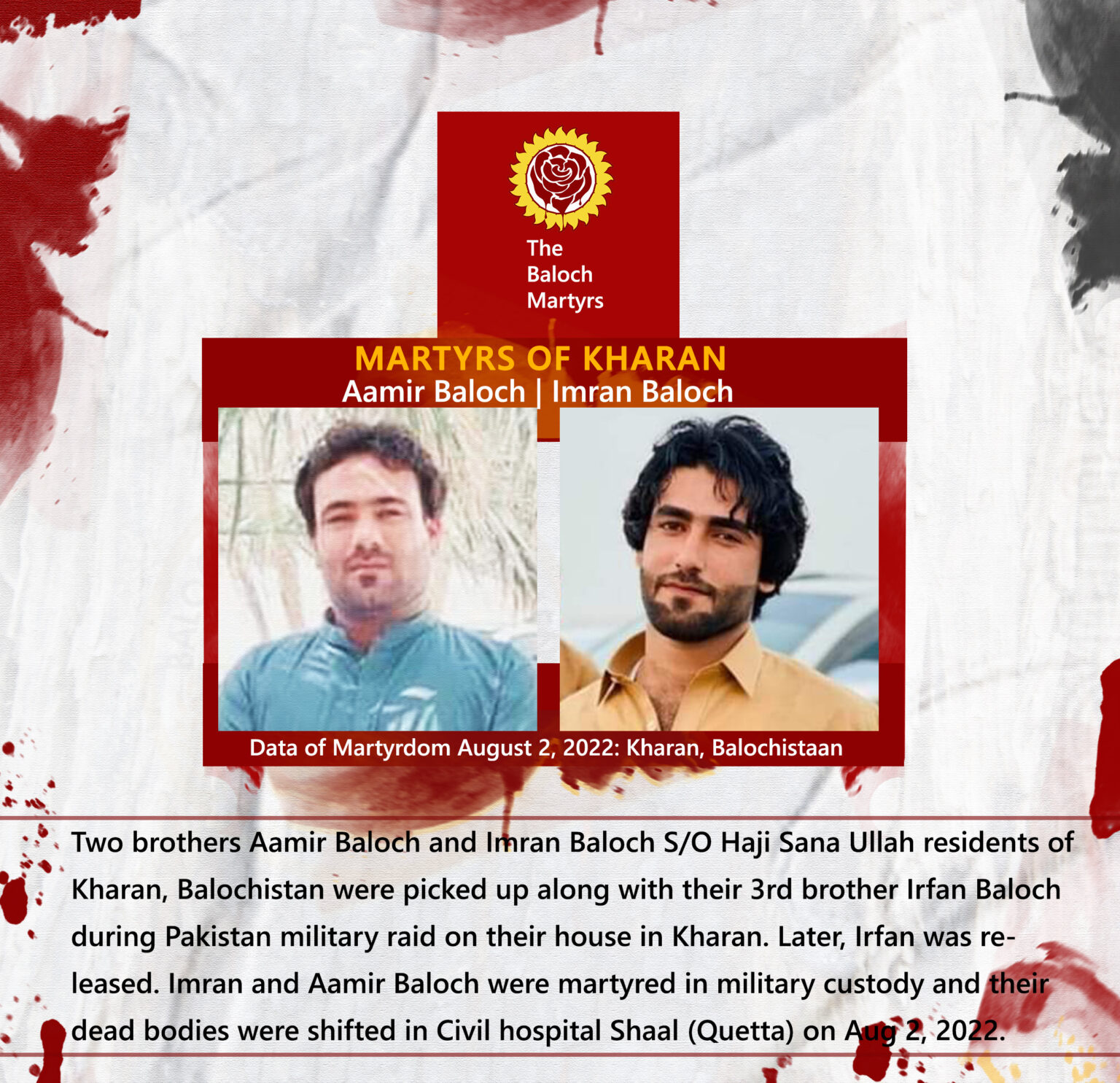 Two brothers Aamir Baloch and Imran Baloch S/O Haji Sana Ullah residents of Kharan, Balochistan were picked up along with their 3rd brother Irfan Baloch during Pakistan military raid on their house in Kharan. Later, Irfan was released. Imran and Aamir Baloch were martyred in military custody and their dead bodies were shifted in Civil hospital Shaal (Quetta) on Aug 2, 2022.