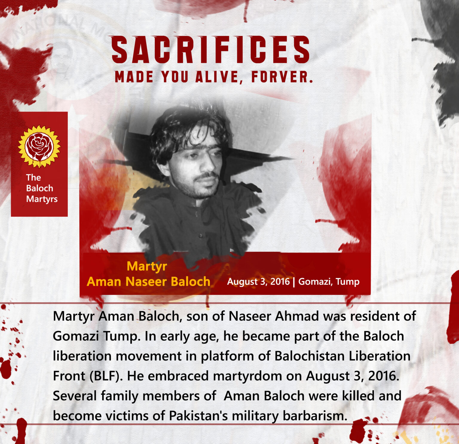 Martyr Aman Baloch, son of Naseer Ahmad was resident of Gomazi Tump. In early age, he became part of the Baloch liberation movement in platform of Balochistan Liberation Front (BLF). He embraced martyrdom on August 3, 2016. Several family members ofย ย Aman Baloch were killed and become victims of Pakistan’s military barbarism.