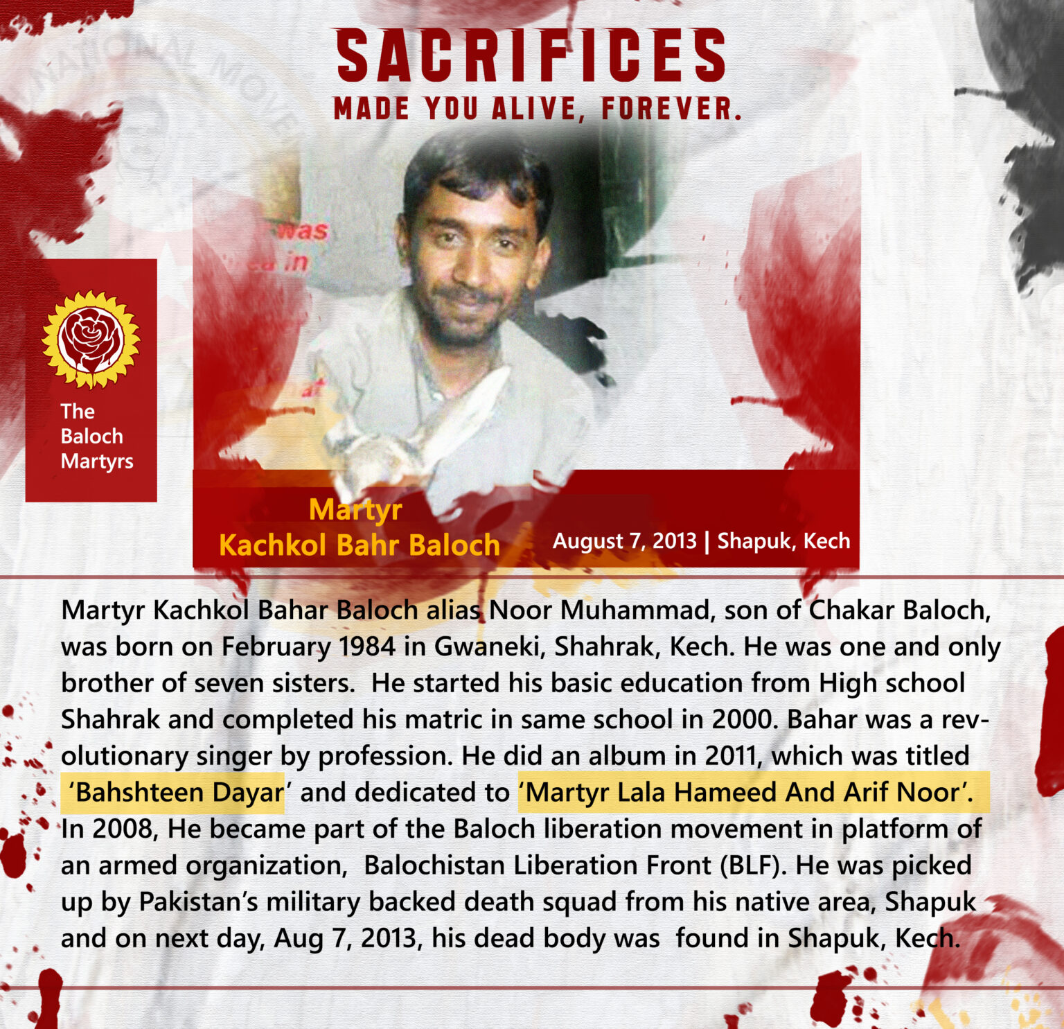 Martyr Kachkol Bahar Baloch alias Noor Muhammad, son of Chakar Baloch, was born on February 1984 in Gwaneki, Shahrak, Kech. He was one and only brother of seven sisters. He started his basic education from High school Shahrak and completed his matric in same school in 2000. Bahar was a revolutionary singer by profession. He did an album in 2011, which was titled βBahshteen Dayarβ and dedicated to βMartyr Lala Hameed And Arif Noorβ. In 2008, He became part of the Baloch liberation movement in platform of an armed organization, Balochistan Liberation Front (BLF). He was picked up by Pakistanβs military backed death squad from his native area, Shapuk and on next day, Aug 7, 2013, his dead body was found in Shapuk, Kech.