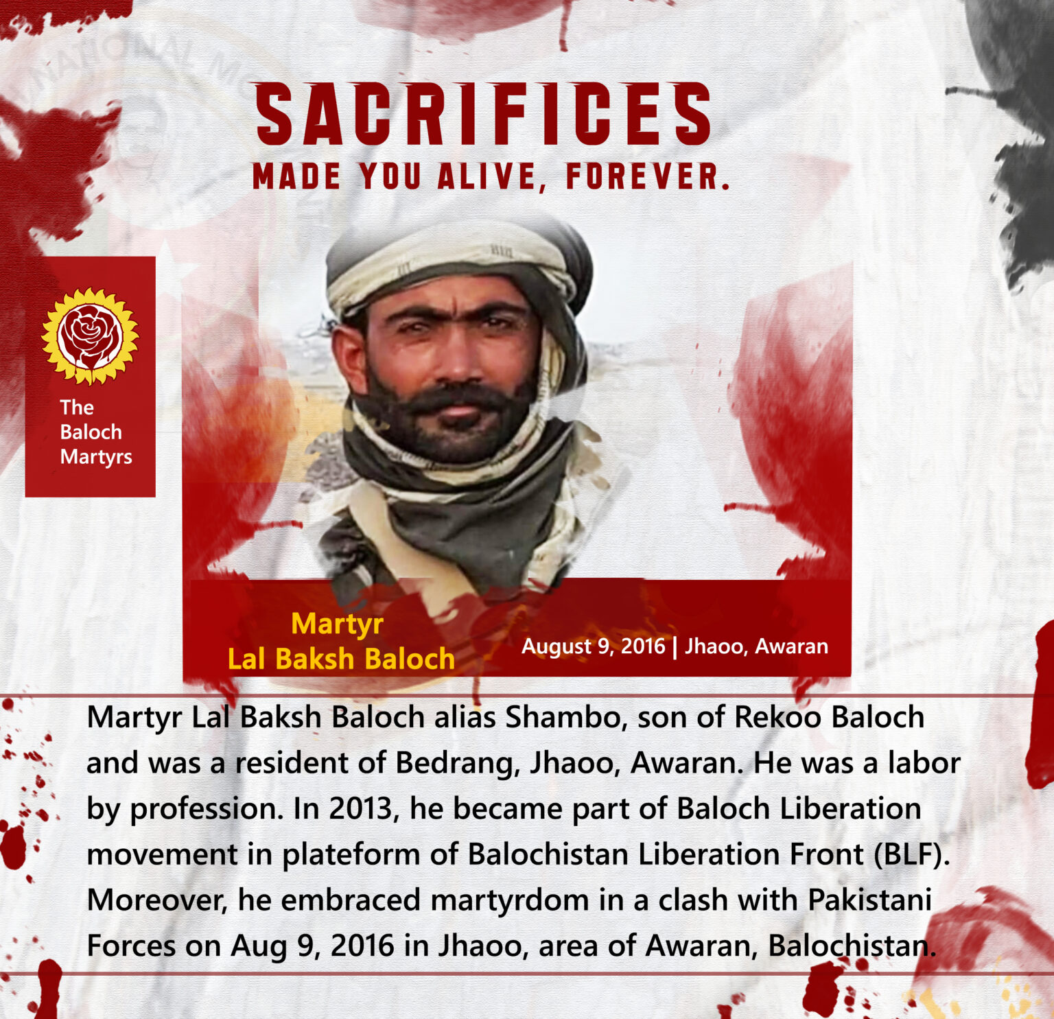 Martyr Lal Baksh Baloch alias Shambo, son of Rekoo Baloch and was a resident of Bedrang, Jhaoo, Awaran. He was a labor by profession. In 2013, he became part of Baloch Liberation movement in plateform of Balochistan Liberation Front (BLF). Moreover, he embraced martyrdom in a clash with Pakistani Forces on Aug 9, 2016 in Jhaoo, area of Awaran, Balochistan.