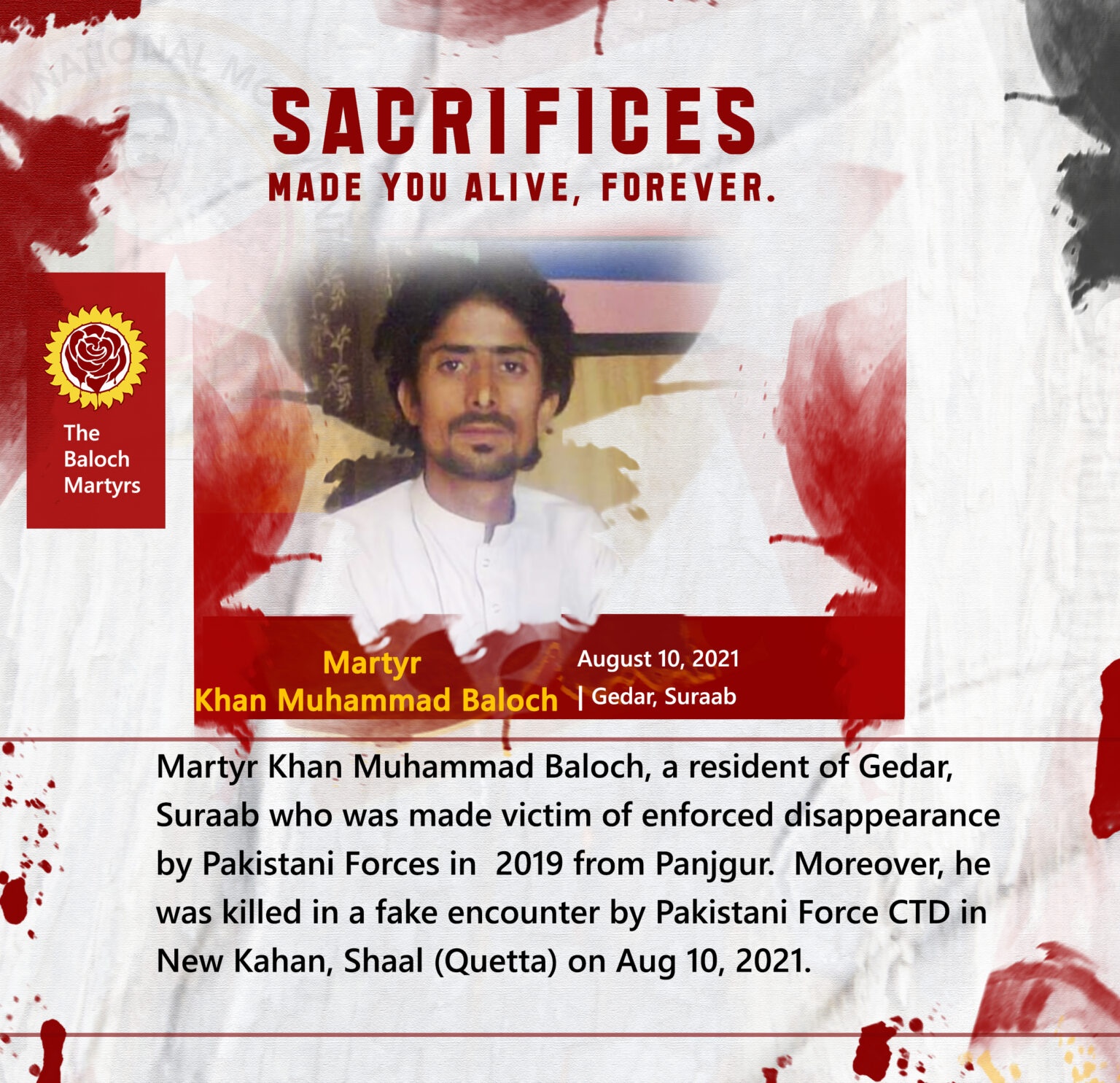 Martyr Khan Muhammad Baloch, a resident of Gedar, Suraab who was made victim of enforced disappearance by Pakistani Forces in 2019 from Panjgur. Moreover, he was killed in a fake encounter by Pakistani Force CTD in New Kahan, Shaal (Quetta) on Aug 10, 2021.