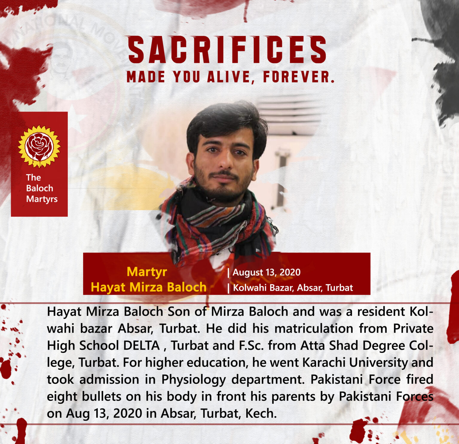 Hayat Mirza Baloch Son of Mirza Baloch and was a resident Kolwahi bazar Absar, Turbat. He did his matriculation from Private High School DELTA , Turbat and F.Sc. from Atta Shad Degree College, Turbat. For higher education, he went Karachi University and took admission in Physiology department. Pakistani Force fired eight bullets on his body in front his parents by Pakistani Forces on Aug 13, 2020 in Absar, Turbat, Kech.