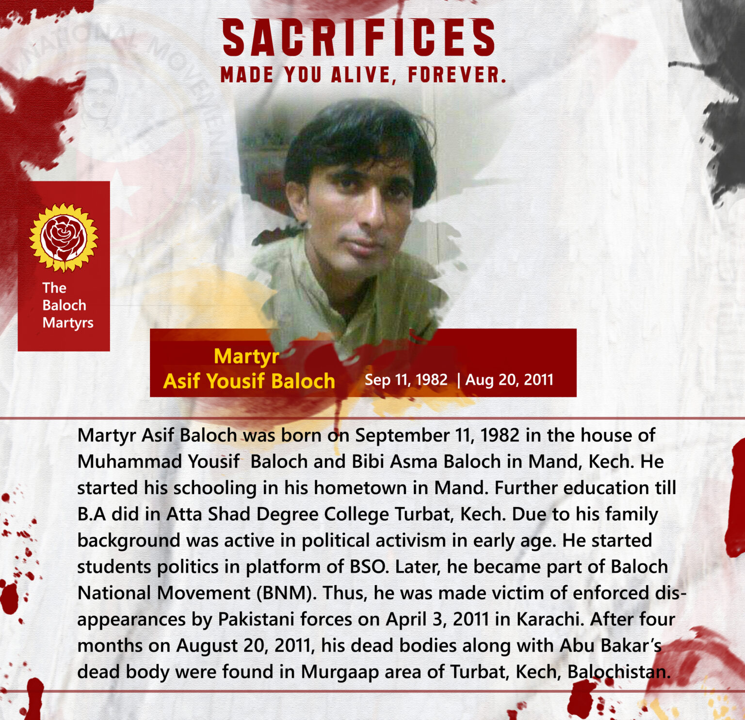 Martyr Asif Baloch was born on September 11, 1982 in the house of Muhammad Yousif Baloch and Bibi Asma Baloch in Mand, Kech. He started his schooling in his hometown in Mand. Further education till B.A did in Atta Shad Degree College Turbat, Kech. Due to his family background was active in political activism in early age. He started students politics in platform of BSO. Later, he became part of Baloch National Movement (BNM). Thus, he was made victim of enforced disappearances by Pakistani forces on April 3, 2011 in Karachi. After four months on August 20, 2011, his dead bodies along with Abu Bakarβs dead body were found in Murgaap area of Turbat, Kech, Balochistan.
