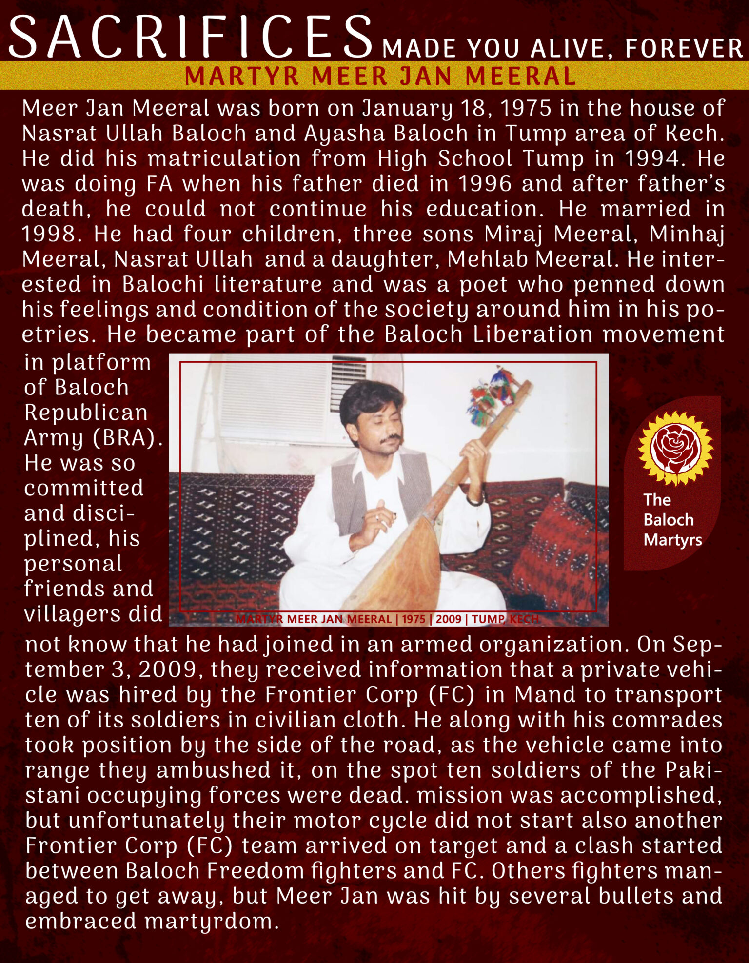 Meer Jan Meeral was born on January 18, 1975 in the house of Nasrat Ullah Baloch and Ayasha Baloch in Tump area of Kech. He did his matriculation from High School Tump in 1994. He was doing FA when his father died in 1996 and after fatherโs death, he could not continue his education. He married in 1998. He had four children, three sons Miraj Meeral, Minhaj Meeral, Nasrat Ullahย ย and a daughter, Mehlab Meeral. He interested in Balochi literature and was a poet who penned down his feelings and condition of the society around him in his poetries. He became part of Baloch Liberation movement in the platform of Baloch Republican Army (BRA). He was so committed and disciplined, his personal friends and villagers did not know that he had joined in an armed organization. On September 3, 2009, he received information that a private vehicle was hired by the Frontier Corp (FC) in Mand to transport ten of its soldiers in civilian cloth. He along with his comrades took position by the side of the road, as the vehicle came into range they ambushed it, on the spot several soldiers of the Pakistani occupying forces were dead. mission was accomplished, but unfortunately their motor cycle did not start also another Frontier Corp (FC) team arrived on target and a clash started between Baloch Freedom fighters and FC. Others fighters managed to get away, but Meer Jan was hit by several bullets and embraced martyrdom.ย