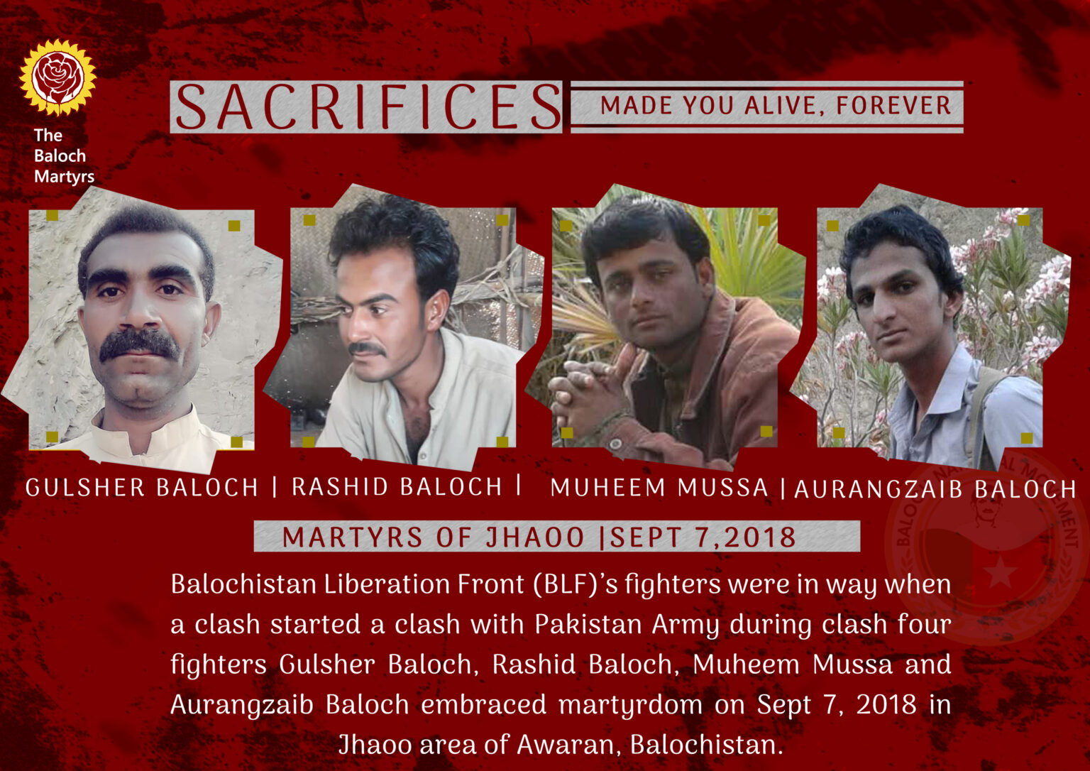 Balochistan Liberation Front (BLF)’s fighters were in way when a clash started a clash with Pakistan Army during clash four fighters Gulsher Baloch, Rashid Baloch, Muheem Mussa and Aurangzaib Baloch embraced martyrdom on Sept 7, 2018 in Jhaoo area of Awaran, Balochistan.