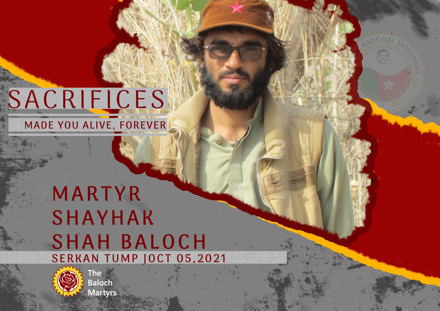 Martyr Shayhak Shah, Son of Dil Jan and Zuhra Baloch, Resident of Serkan, Tump, Kech, Balochistan was a poet by profession. According to organization’s statement; He became part of Baloch liberation movement in platform of the Balochistan Liberation Front (BLF) in 2013. He was a so brave, well aware revolutionary and young poet. He embraced martyrdom during military clash with Pakistan’s military backed dead squads in Injeer Kahn, Kulbar area of Naq, Kech on Oct 5, 2021.
