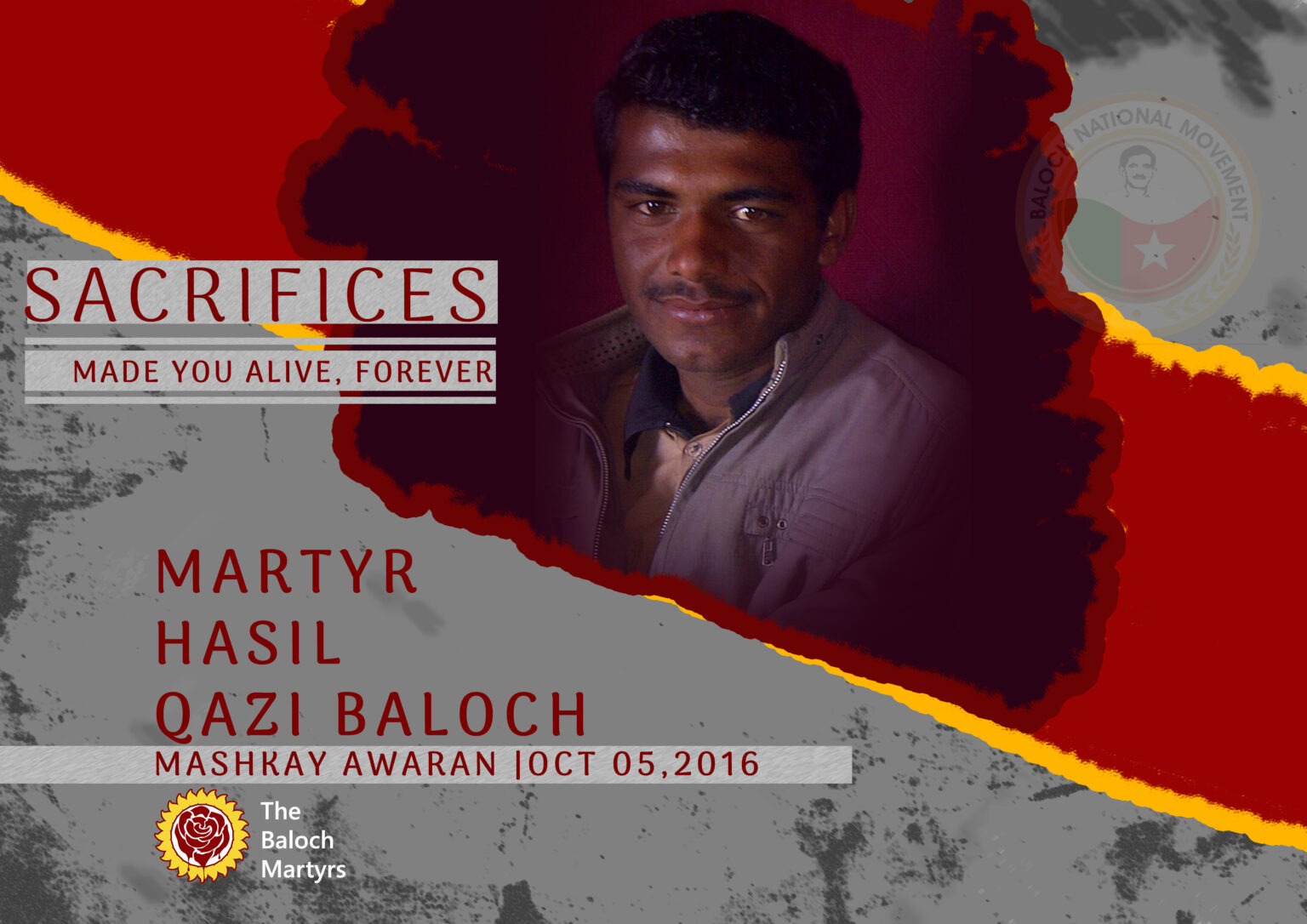 Martyr Hasil Baloch s/o Master Arz Muhammad got birth on January 2, 1995 in Mandeel Mashkay, district Awaran. Hasil Baloch was a student of intermediate at Inter College Awaran and president of BSO Azad Mashkay zone. He had played an important role in organizing the political activities of the organization in Mashkay region. He was a devoted worker for the Organization and had interest in reading revolutionary literature.Β