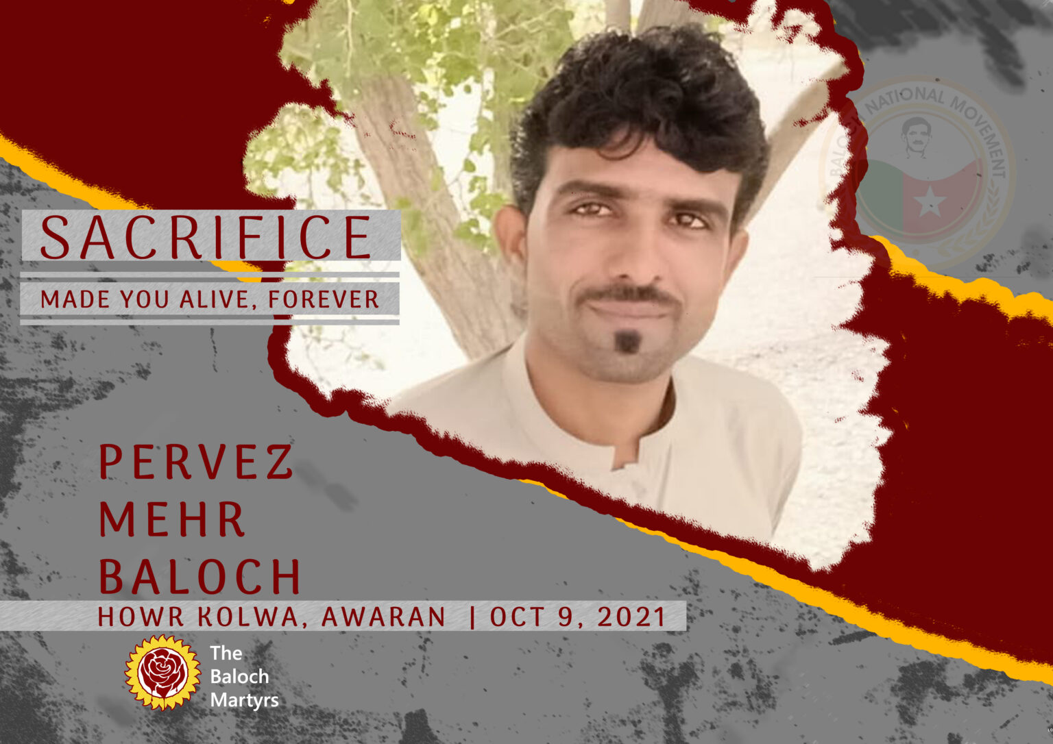 Marty Pervez Mehr Alias Malook Baloch son of Nuguman and Haneefa Baloch, was a resident of Howr, Kolwa area of Awaran, Balochistan. According to organizational statement; He was become part of the Baloch liberation movement in the platform Balochistan Liberation Front (BLF) in 2014. He embraced martyrdom along with other his comrades Asad Baloch, Akil Azad and Saki Baksh during a clash with Pakistanโs Army in Madag e Kaor, area of Kolwa, Kech, Balochistan on Oct 9, 2021.