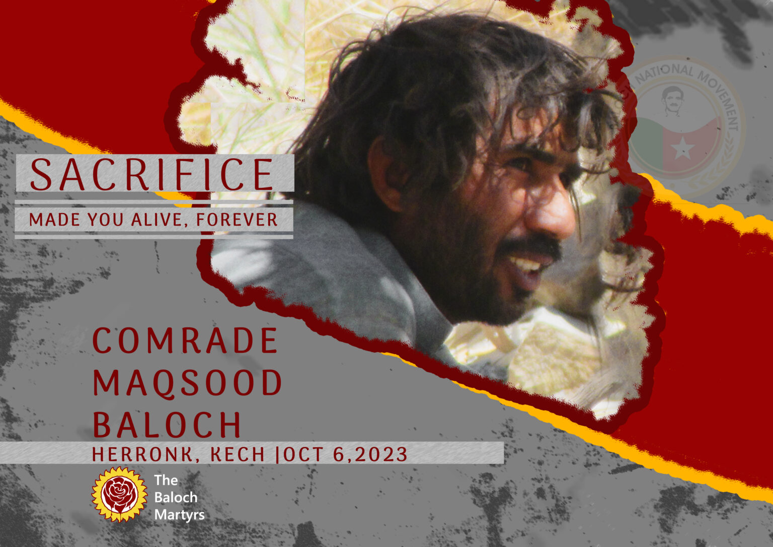 Martyr Comrade Maqsood alias Comrade Mehrwan Baloch, son of Ahmed and was a resident of Herronk, area of Kech Balochistan. He started his students politics in platform of BSO Azad and he was known as a dedicated and active comrade. After years in 2012, he joined the Baloch armed struggle in the platform of the Balochistan Liberation Front (BLF). Later in 2015, he joined Baloch Liberation Army (BLA).