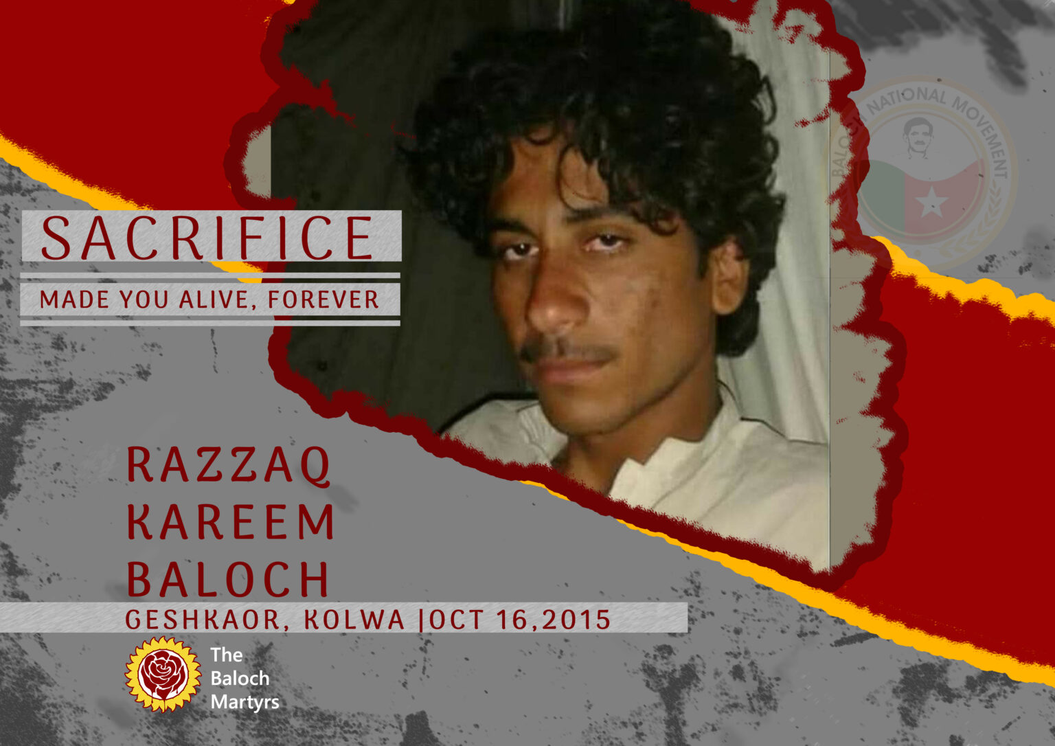 Martyr Razzaq Baloch was a resident of Geshkaor, Kolwa area of Awaran, Balochistan. He affiliated with a pro-independence organization, Baloch Republican Army (BRA) for years. He along with other his two comrades Siraj Baloch and Bahoot Baloch embraced martyrdom during a clash with Pakistan Army area of Rekachai between Mahra, Kolwa, Awaran on Oct 16, 2015.