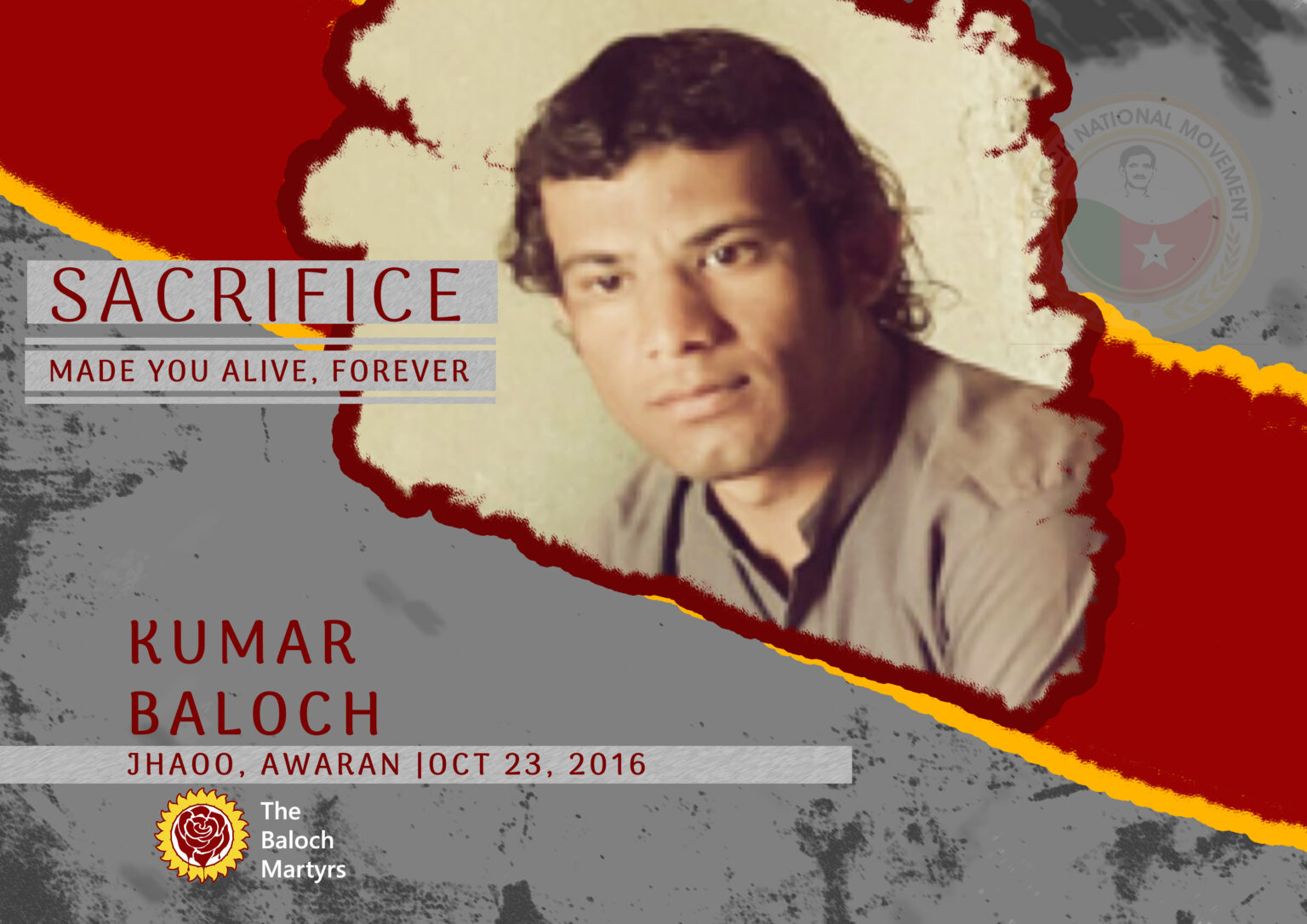Kumar Baloch commenced his political career on the platform of Baloch Students Organization (BSO Azad) in 2009 and till his martyrdom he was a part of BSO Azad performing on different positions of the Organization. When he got martyrdom at the hands of the Pakistani state, he was serving as the organizer of the Jhaoo Zone. He believed in political struggle and was targeted for his exercise of peaceful political expression. He was killed by Pakistani-backed religious extremists in Korak Jhaoo, Awaran, on October 23, 2016.