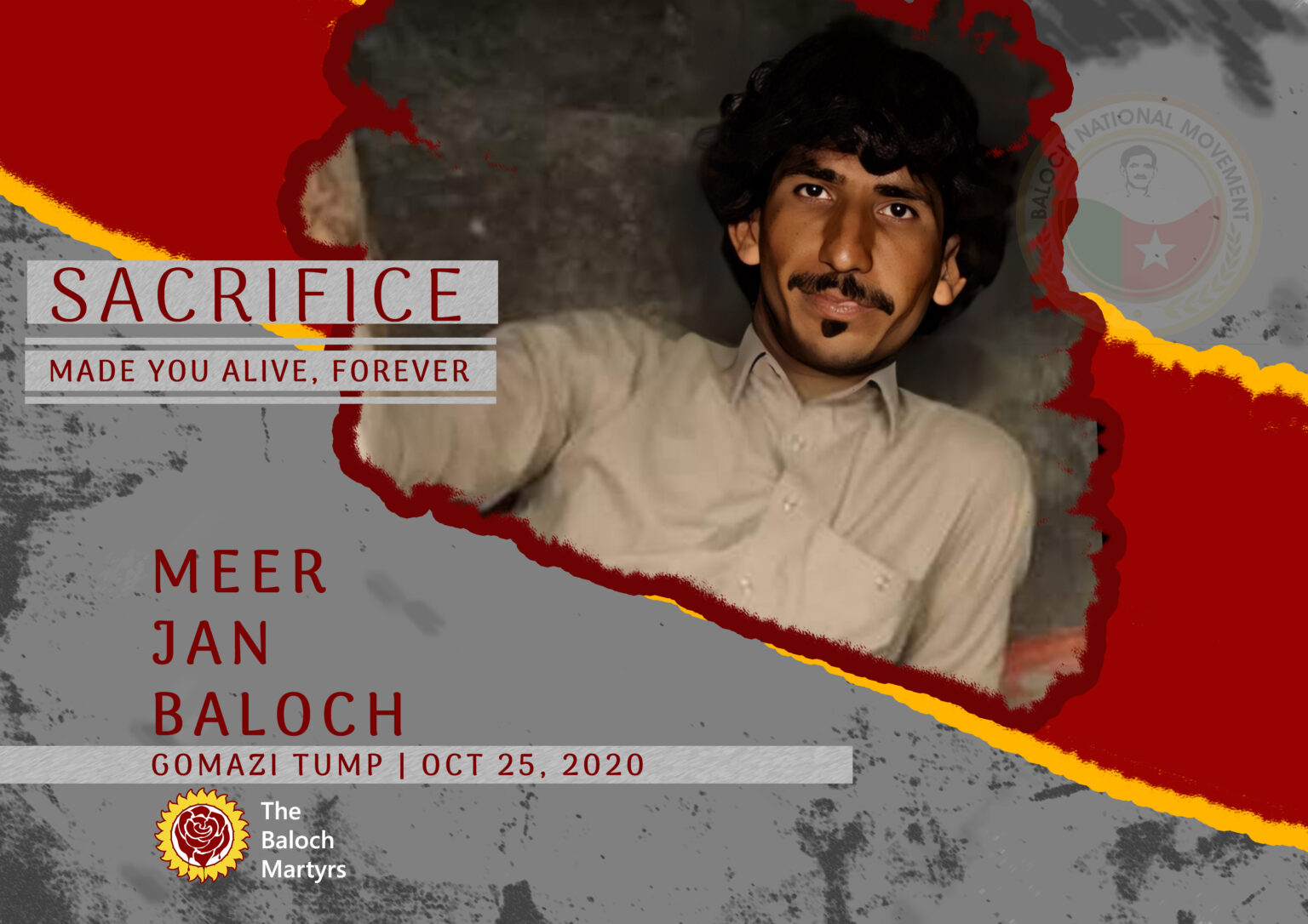 Martyr Meer Jan alias Ajaz Baloch was a resident Gomazi area of Tump, Balochistan. He affiliated with Baloch Liberation Front (BLF) for years. He embraced martyrdom along BLA’s comrade Mubesher Baloch during a military clash with Pakistan Army when their camp was attacked in Kulbar area of Kech on Oct 25, 2020.
