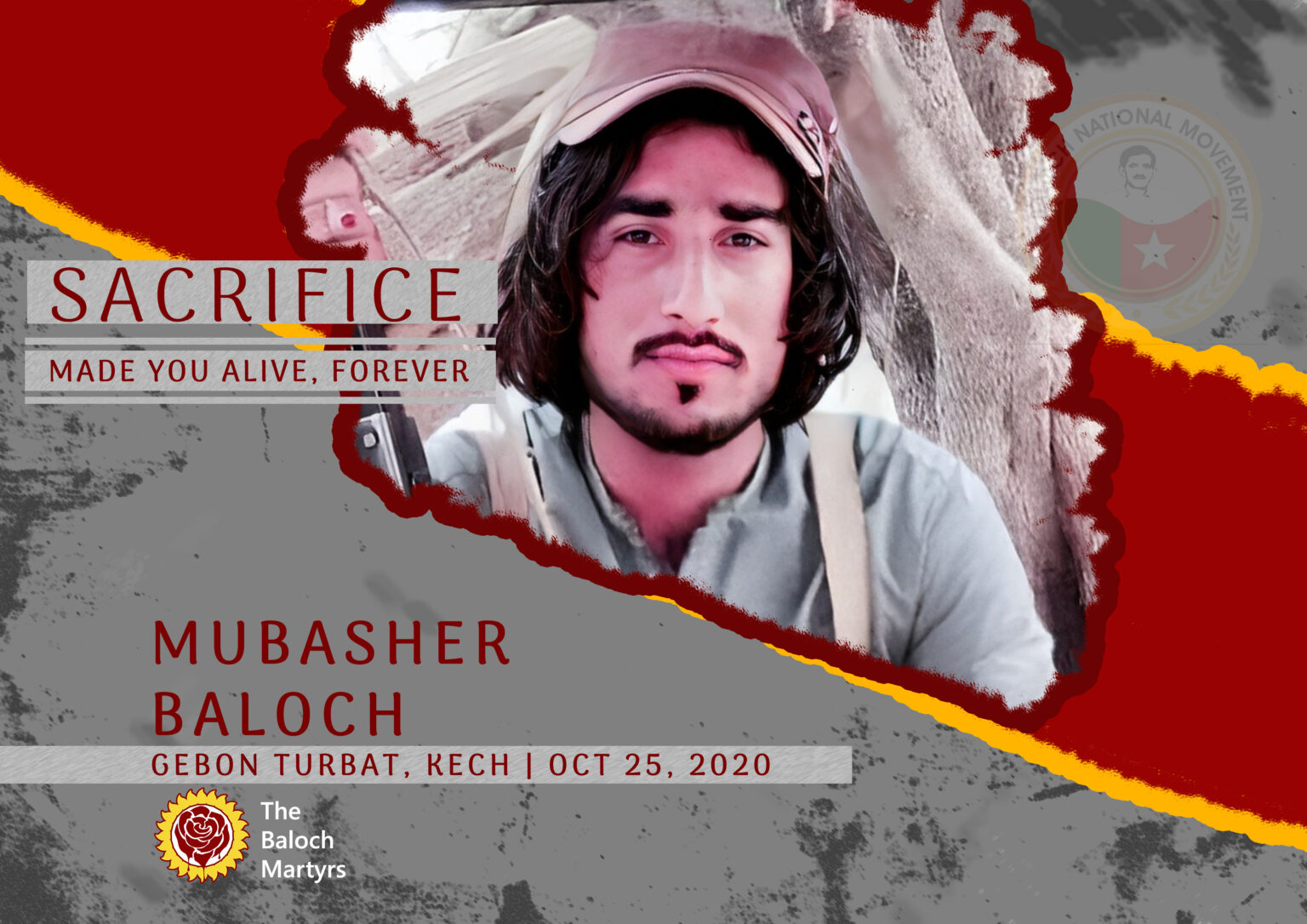 Martyr Mubasher Baloch alias Shahdost Baloch was born in the house of Hoth Rasool Baksh and Han Bibi Baloch in Gebon, Turbat area of Kech, Balochistan. He affiliated with Baloch Liberation Army (BLA) for years. He embraced martyrdom along BLF’s comrade Meer Jan  Baloch during a military clash with Pakistan Army when their camp was attacked in Kulbar area of Kech on Oct 25, 2020.