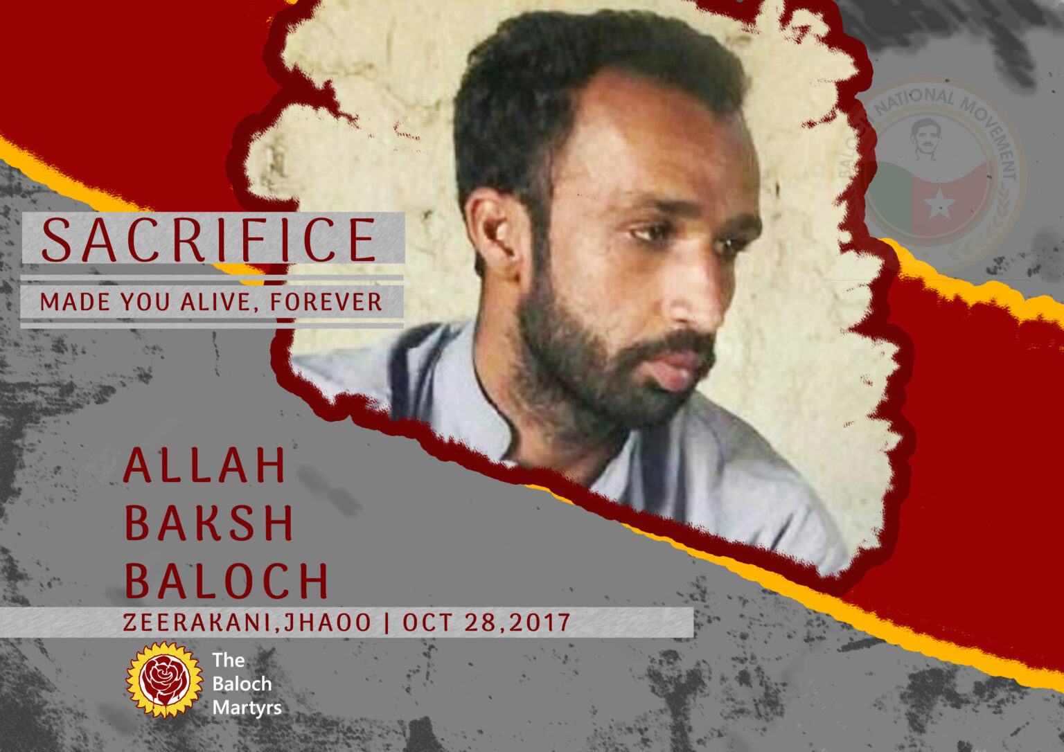 Martyr Allah Baksh Baloch was born in the house of Yaqoob Baloch and Sharatoon Baloch in Zeerkani, Jhaoo area of Awaran, Balochistan. He was affiliated with a pro-independence organization, Balochistan Liberation Front (BLF). He embraced martyrdom along with his comrade, Razzaq Baloch during clash with Pakistan Army on Oct 28, 2017.ย