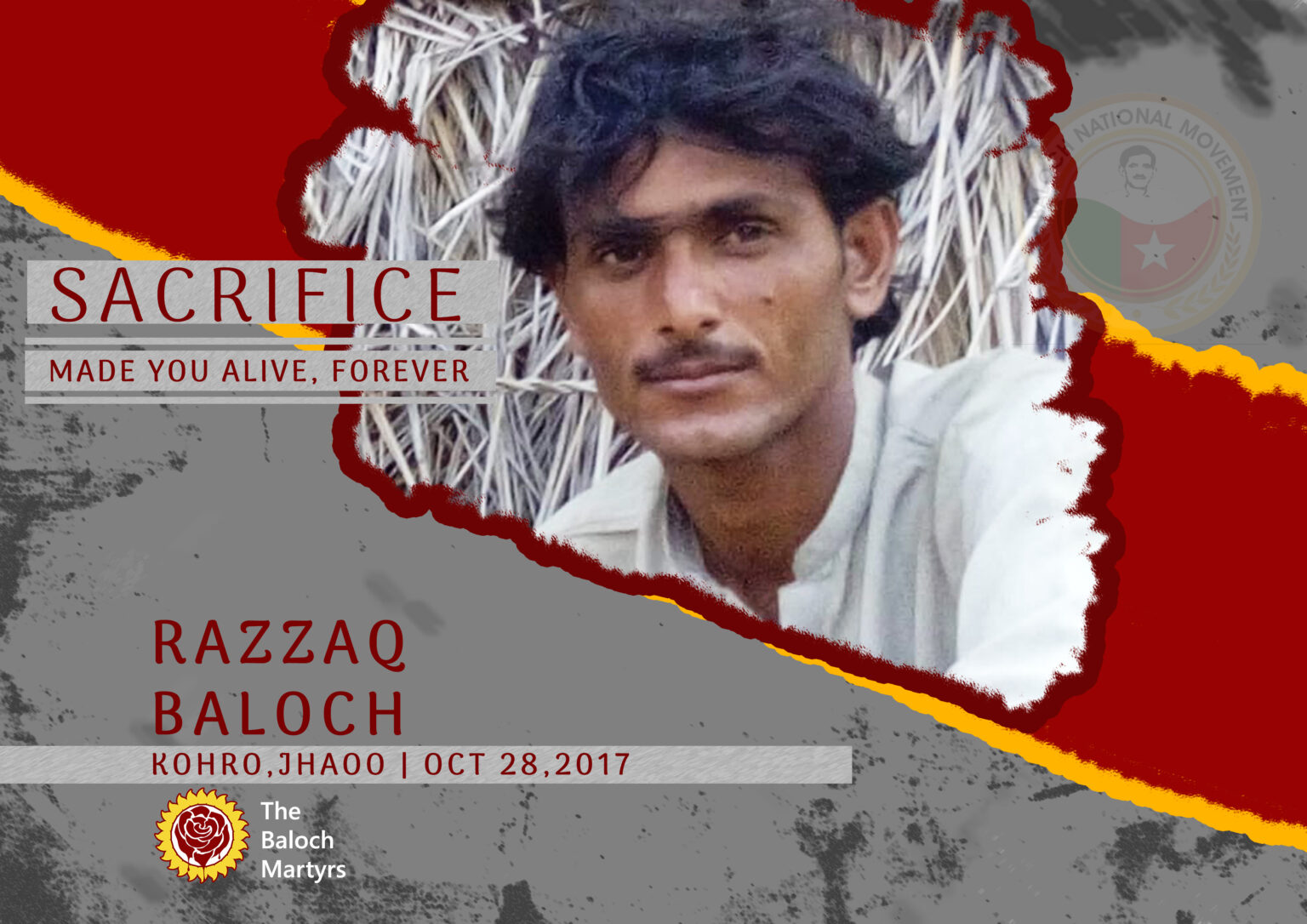 Martyr Razzaq Baloch was born in the house of Qadir Baksh Baloch and Isyaan Baloch in Kohro, Jhaoo area of Awaran, Balochistan. He was affiliated with a pro-independence organization, Balochistan Liberation Front (BLF). He embraced martyrdom along with his comrade, Allah Baksh Yaqoob during clash with Pakistan Army on Oct 28, 2017.Β