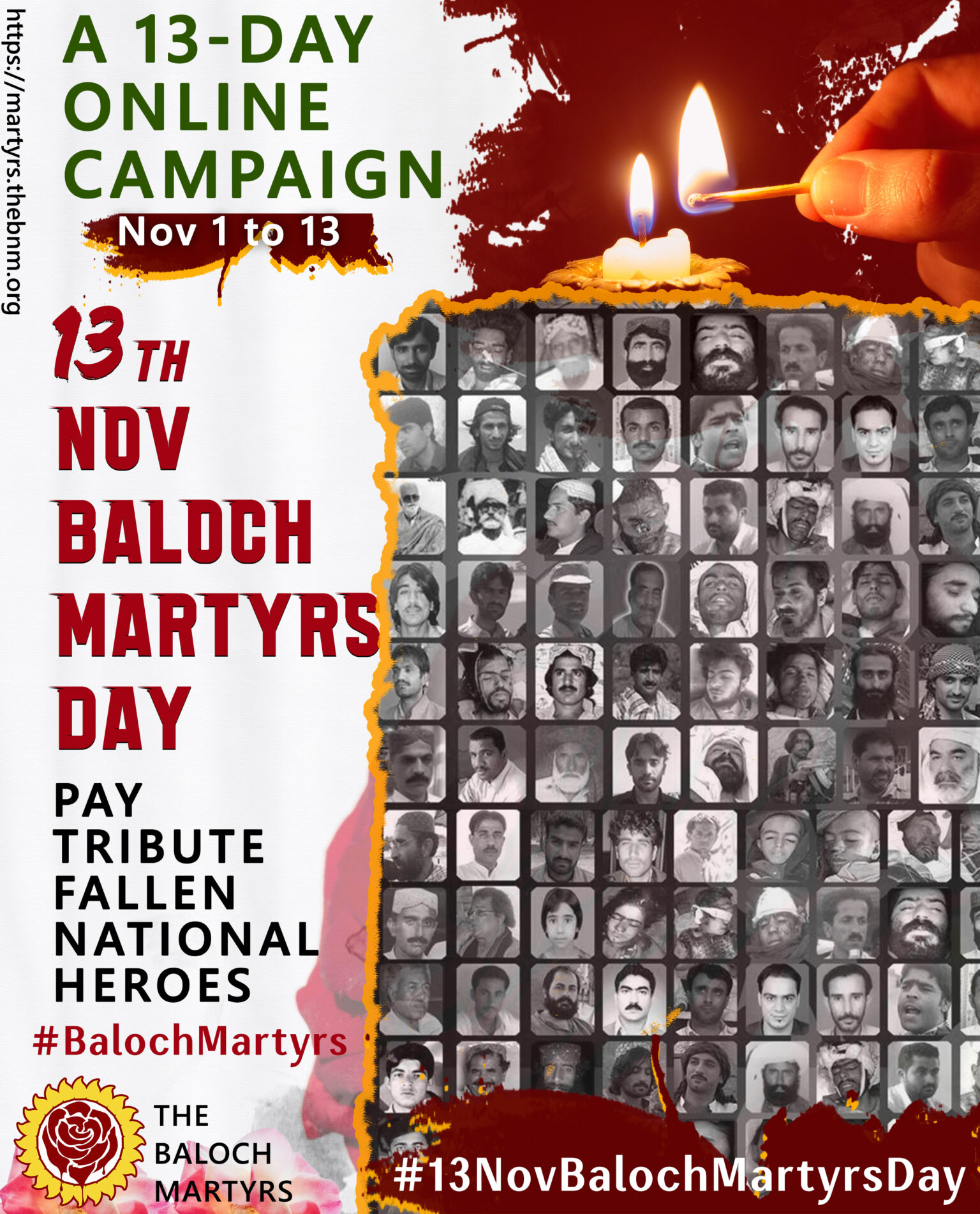 We are going to start a 13-day online campaign on the historical day of 13th Nov Baloch Martyrs Day. The campaign will be run from Nov 1 to Nov 13, 2023. Let’s join the campaign and pay tribute to the fallen heroes of the Baloch nation.
