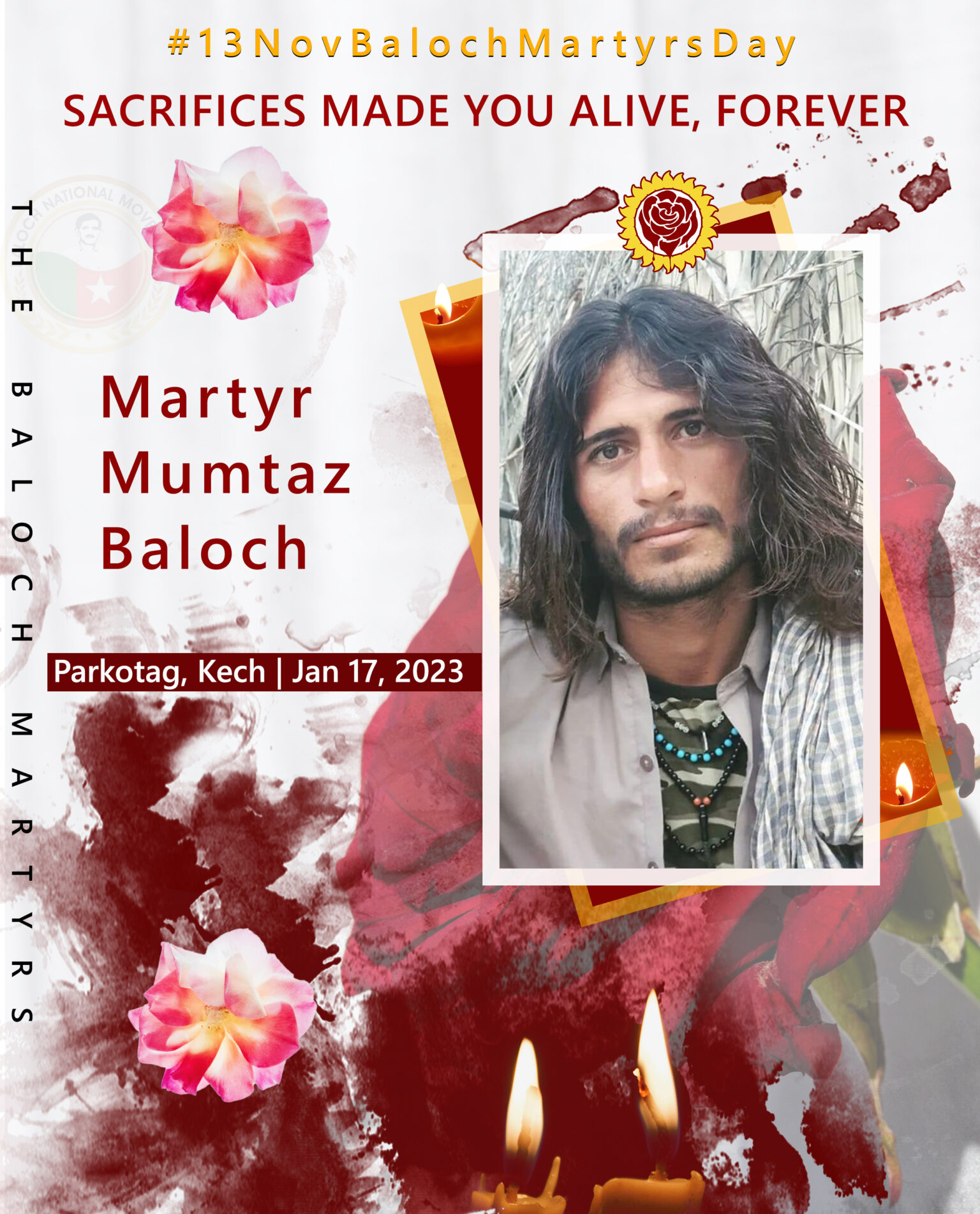 Mumtaz Baloch Alias Mullah Yasir Baloch, son of Qazi Baloch and was a resident of Perkotag, Hoshab area of Kech, Balochistan. He affiliated with Baloch Liberation Army (BLA) in 2017. He embraced martyrdom along with his three BLF’s freedom fighters, Aamir Meskan Baloch, Yahya and Raza Baloch during military operation of  Pakistan Army on January 17, 2023 in Gwarkup area of  Kech, Balochistan.