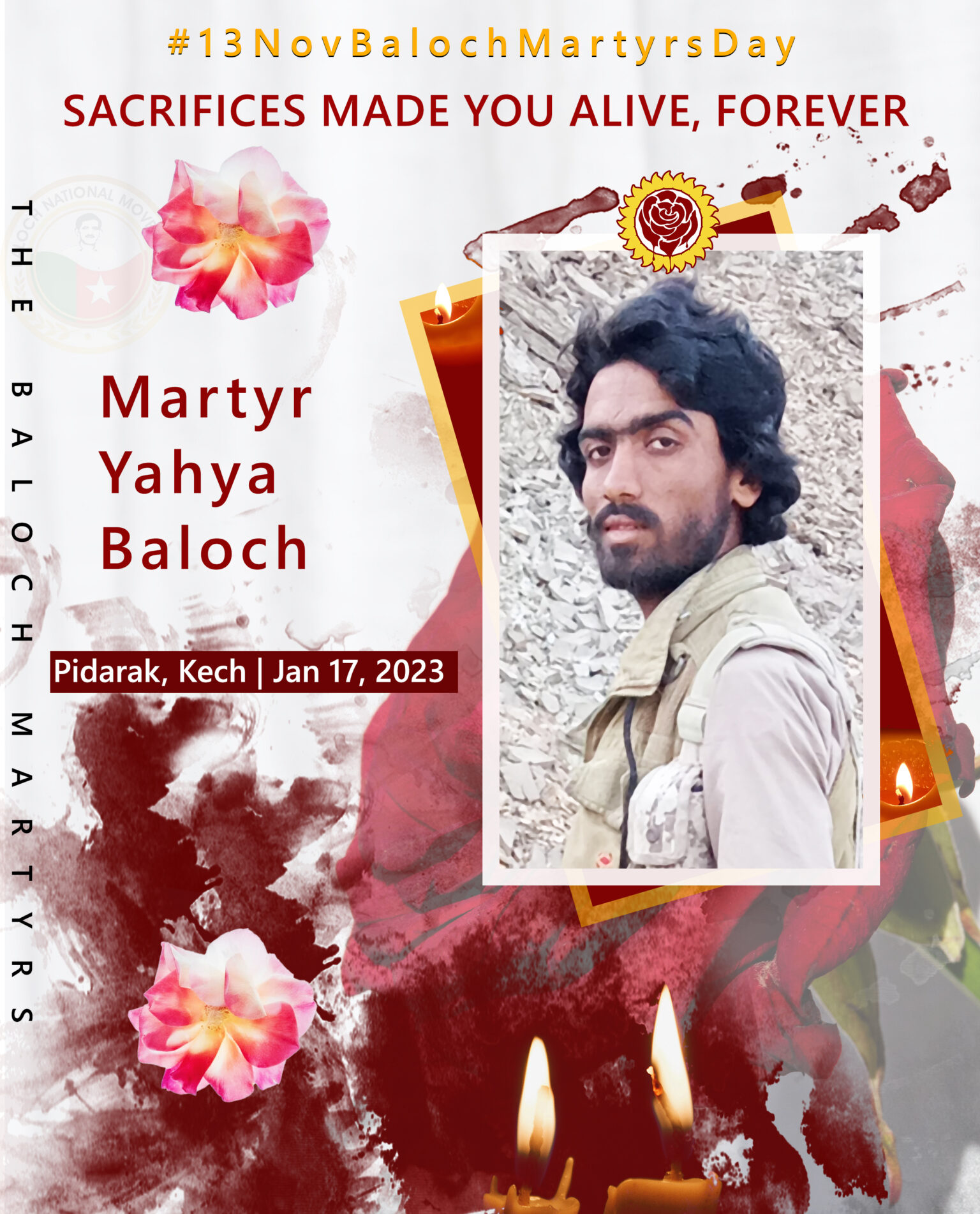 Martyr Yahya Baloch alias Kambar Baloch, son of  Dr.  Asumi Baloch and was a resident of Pidarak area of  Kech. He affiliated with pro-independence organization, Balochistan Liberation Front (BLF) for years in a city unite of organization and on May 25, 2022,  he joined organizational military camp in mountainous area of  Balochistan. He embraced martyrdom along with his three comrades, Aamir Meskan Baloch, Raza Baloch, and Mumtaz Baloch (BLA) during military operation of  Pakistan Army on January 17, 2023 in Gwarkup area of  Kech, Balochistan.