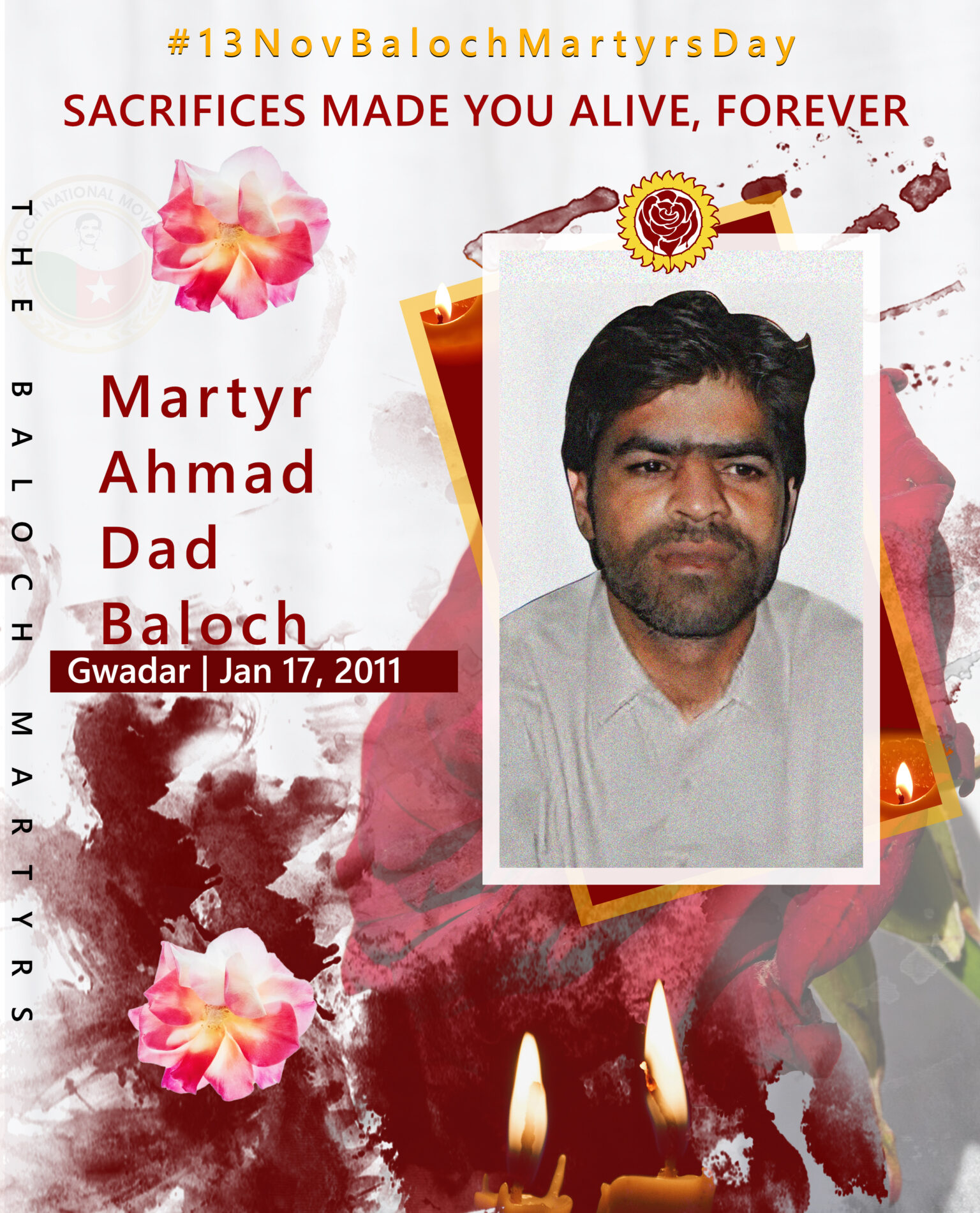 13 Nov Baloch Martyrs Day13 Nov Baloch Martyrs Day 2023BRPJanuaryPostersMartyr Ahmad Dad Baloch Last updated: November 1, 2023 1:30 pm BNM Share 0 Min Read SHARE Sacrifices Made You Alive, ForeverResident of Gwadar, BalochistanDate oof Martyrdom: Jan 17, 2011 Martyr Ijaz Baloch Martyr Sharbat Baloch Martyr Ghulam Farooq Baloch Martyr Yasir Baloch BalochMartyrs: Sacrifices made you alive, forever (Series 5) TAGGED:#13NovBalochMartyrsDay#Baloch#Balochistan#BalochMartyrs Share This Article Facebook Whatsapp Whatsapp Telegram Email Copy Link Print Leave a Comment Leave a Comment Leave a ReplyYour email address will not be published. Required fields are marked *Comment *Name Email Website Δ