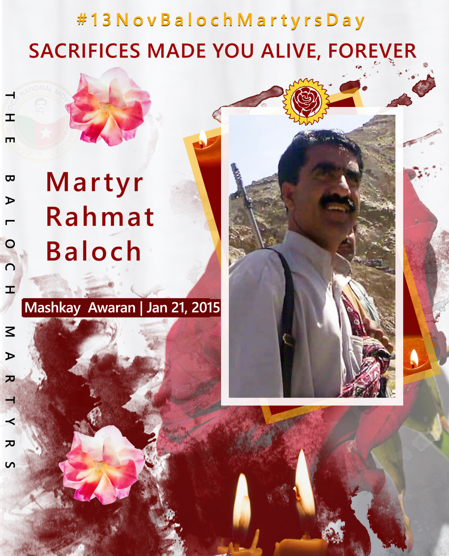 Martyr Rahmat Baloch son of Abdul Karim and was a resident of Gajjar Mashkay area of Awaran, Balochistan. He started his education in Jeebri later in Nukjo. He started his job as a JVT teacher in Awaran. After years, he transferred in Koh e Aspeet, Mashkay. After 2000 while, Baloch liberation movement was upraising in whole Balochistan that time he contributed a vital role for success of rallies and mass gathering of BNM and BSO. Particularly, he took membership in Baloch National Movement (BNM) in 2005.When Chairman Ghulam Mohd and his comrades were abducted and killed by Pakistani forces and a crackdown was continued against political activists in whole Balochistan then Rahmat decided to join armed struggle in platform of Balochistan Liberation Front (BLF) in 2009. Due to his hard work and capabilities soon got position of commander in his organization. He got martyrdom in a clash of Pakistan Army on 21st January 2015 in Mashkay area of Awaran, Balochistan.