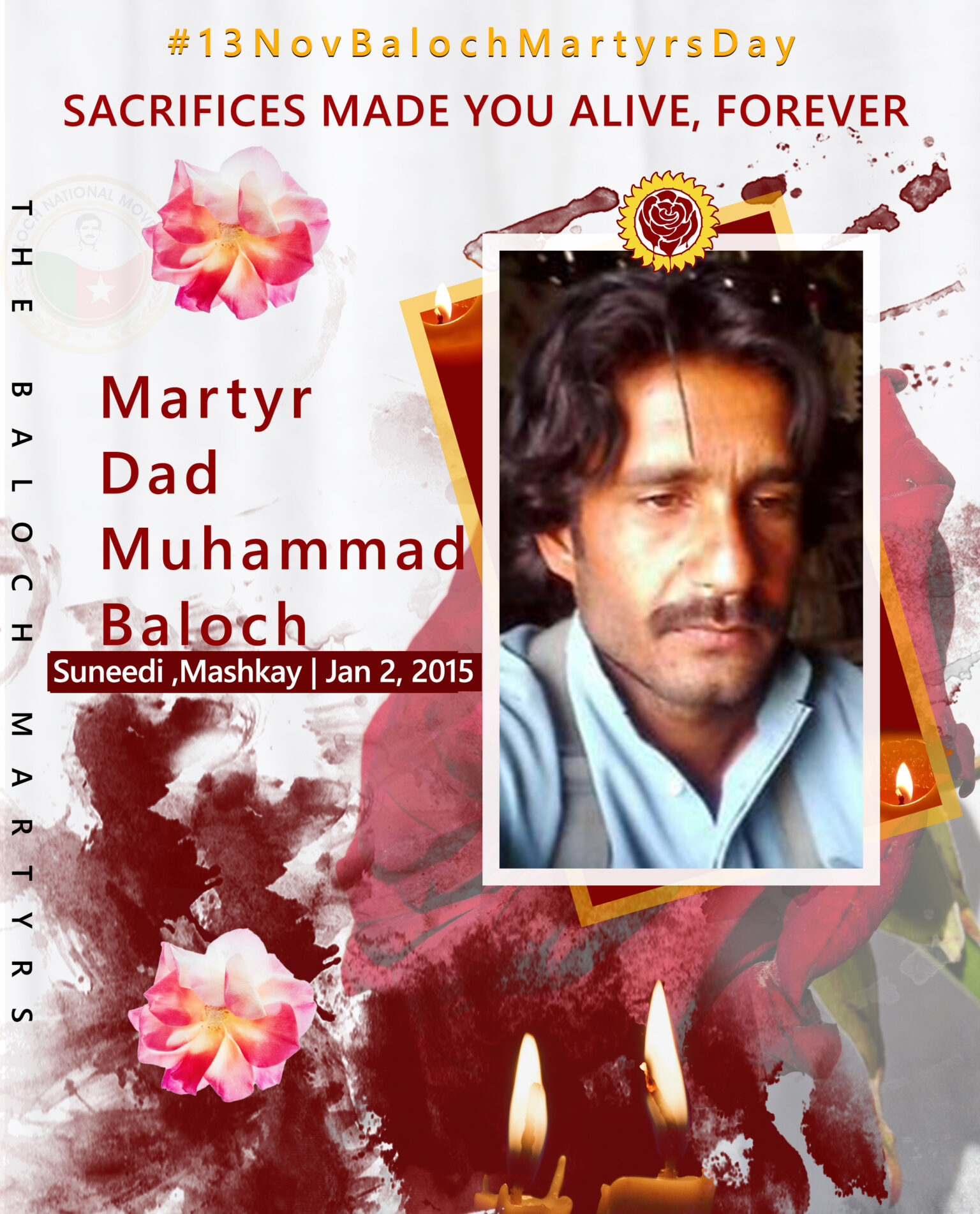 13 Nov Baloch Martyrs DayAwaranJanuaryPostersMartyr Dad Muhammad Baloch Last updated: November 2, 2023 7:53 am BNM Share 0 Min Read Martyr Dad Muhammad Baloch | Jan 2, 2015 SHARE Sacrifices Made You alive, foreverResident of Suneedi, Mashkay area of AwaranDate of martyrdom: Jan 2, 2015 Martyr Sadat Baloch | Mamo Sado Marri Martyr Allah Baksh Baloch Martyr Mehboob Baloch Martyr Aman Baloch November 13 Martyrs’ Day: Honoring the Legacy of Sacrifice by Dr. Naseem Baloch TAGGED:#13NovBalochMartyrsDay#Awaran#Baloch#Balochistan#BalochMartyrs Share This Article Facebook Whatsapp Whatsapp Telegram Email Copy Link Print
