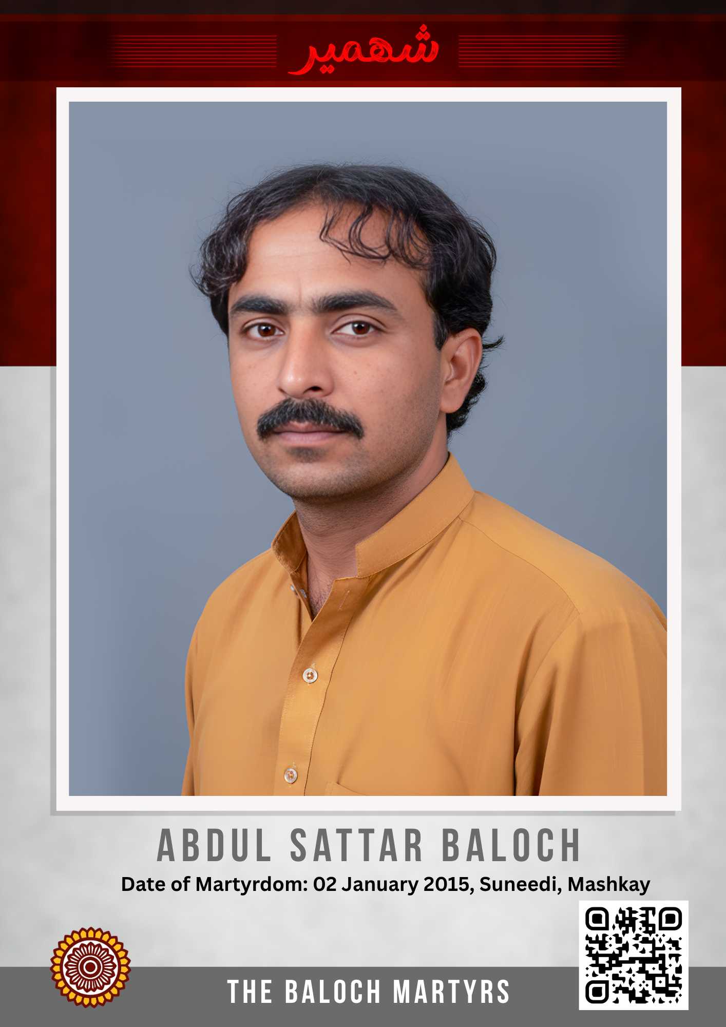 13 Nov Baloch Martyrs DayAwaranJanuaryPostersMartyr Abdul Sattar Baloch Last updated: November 5, 2025 12:03 pm BNM Share 0 Min Read SHARE Sacrifices Made You alive, foreverResident of Suneedi, Mashkay area of AwaranDate of martyrdom: Jan 2, 2015 Martyr Muneer Baloch Martyr Sangat Sana Baloch Martyr Fidayee Muslim Baloch Martyr Noora Baloch (Major Peerak) Martyr Shoaib Baloch TAGGED:#13NovBalochMartyrsDay#Awaran#Baloch#Balochistan#Mashkay Share This Article Facebook Whatsapp Whatsapp Telegram Email Copy Link Print