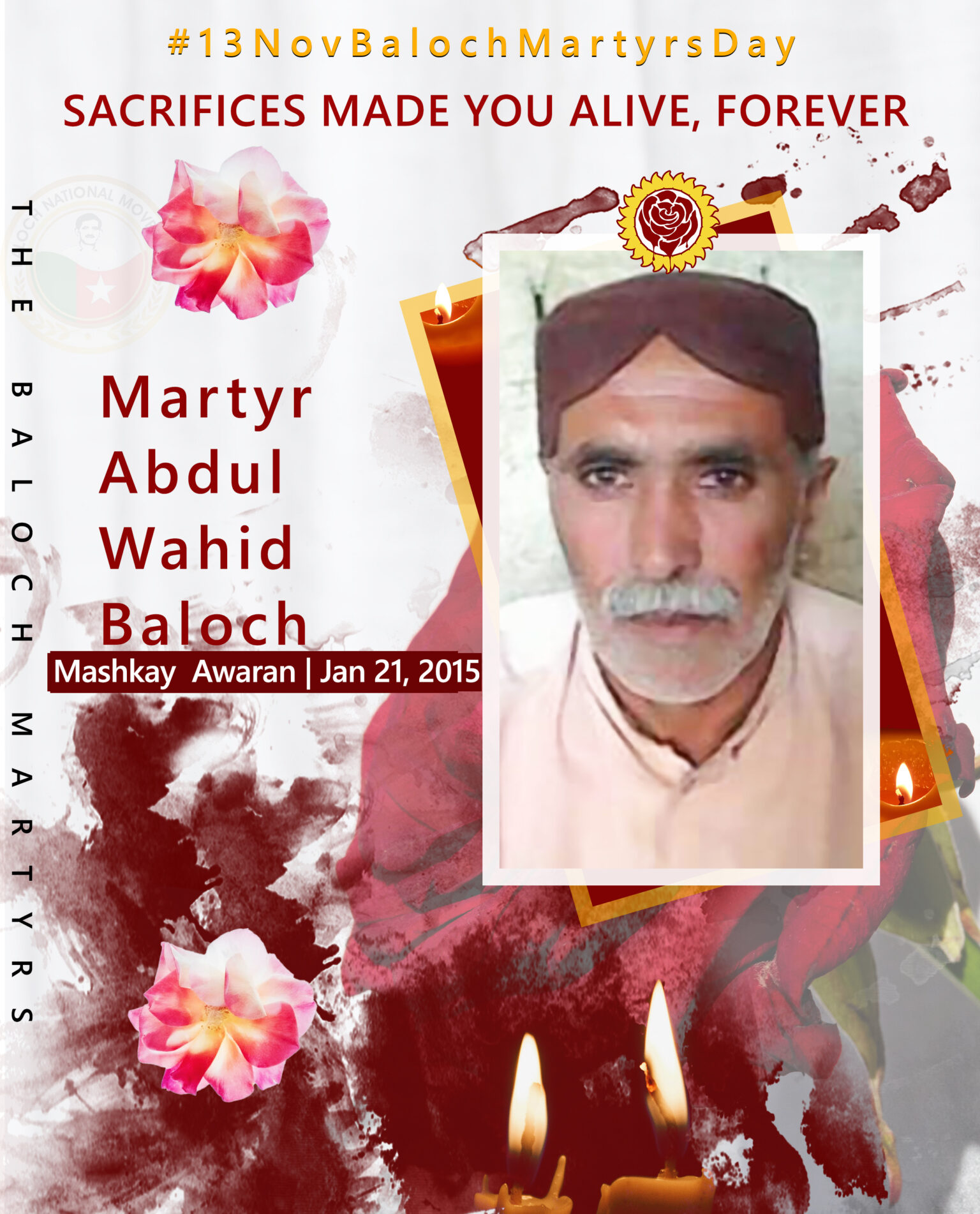 13 Nov Baloch Martyrs DayJanuaryPostersMartyr Abdul Wahid Baloch Last updated: November 2, 2023 3:24 pm BNM Share 0 Min Read SHARE Sacrifices Made You Alive, ForeverResident of Mashkay AwaranDate of Martyrdom: Jan 21, 2015 Detailed Data and Informations about Martyr Kambar Chakar Baloch Martyr Comrade Maqsood Baloch Martyr Abdul Rahman Arif Baloch Martyr Mehrab Khan Baloch Martyr Shahbaz Baloch TAGGED:#13NovBalochMartyrsDay#Awaran#Baloch#Balochistan#BalochMartyrs#Mashkay Share This Article Facebook Whatsapp Whatsapp Telegram Email Copy Link Print