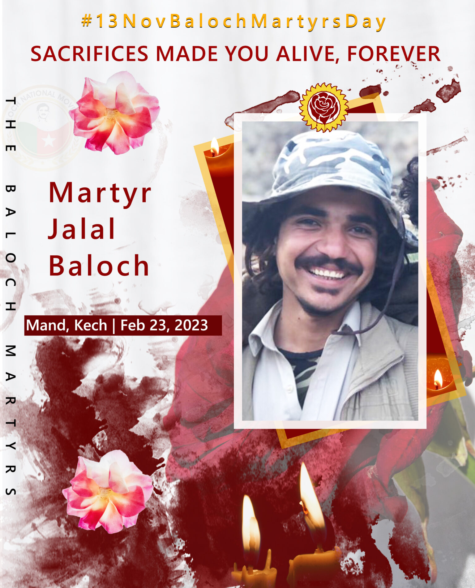 Martyr Jalal Baloch alias Bramsh Baloch, son of Hassan Baloch and was a resident of Talmab, Mand area of Kech, Balochistan. He became part of Baloch liberation movement in the platform of Balochistan Liberation Front (BLF) on May 6, 2021.