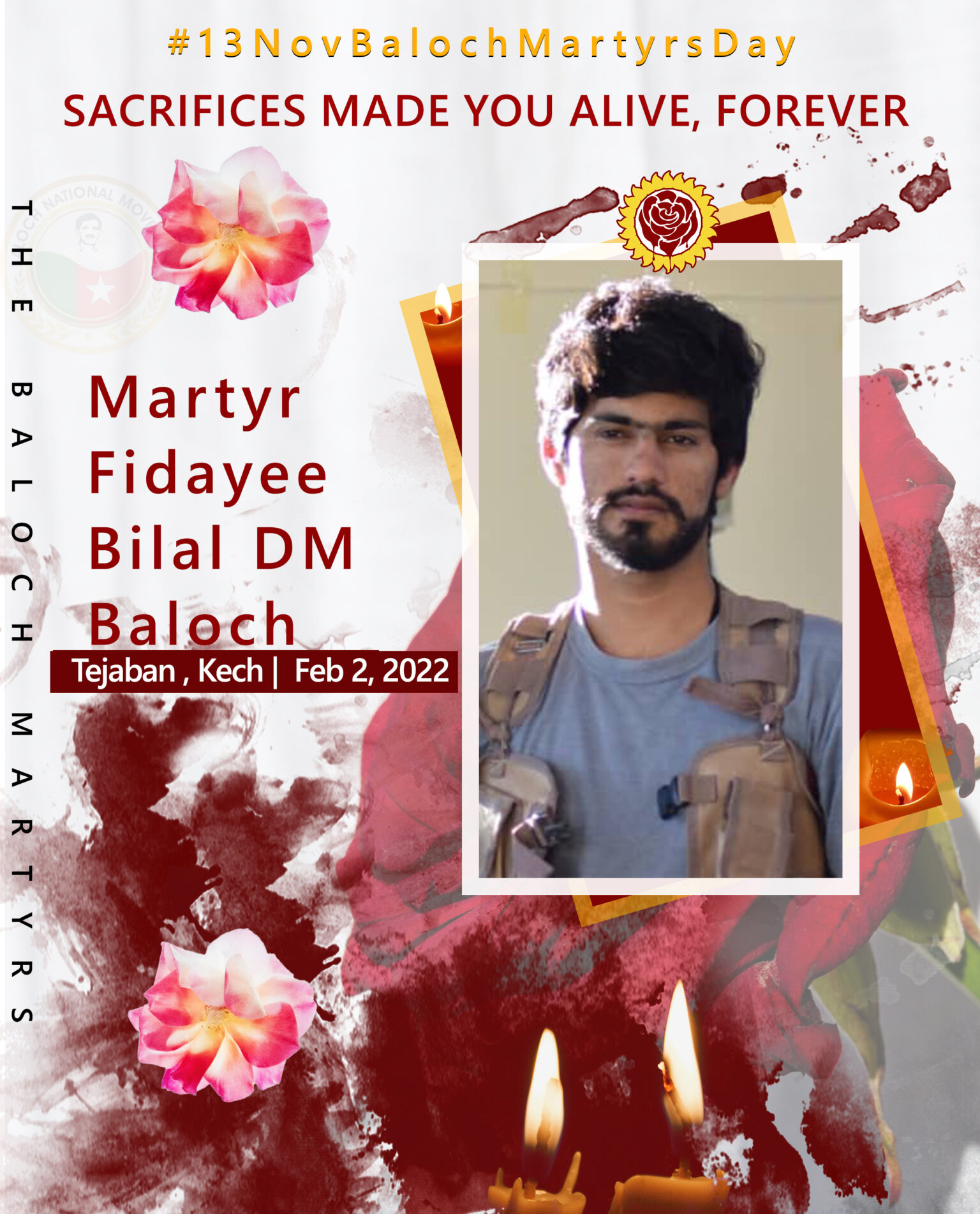 13 Nov Baloch Martyrs DayBLAFebruaryPostersMartyr Fidayee Bilal Baloch Last updated: November 4, 2023 1:11 pm BNM Share 0 Min Read SHARE Sacrifices Made You Alive, ForeverResident of Tejaban, KechDate oof Martyrdom: Feb 2, 2022 Martyr Fidayee Jamal Baloch Martyr Janul Bakhtiyar Martyrs Of Kharan, Imran Baloch | Aamir Baloch Short Introduction: Jameel Yaqoob Martyr Banuk Karima Baloch | Ruzhn-E-Balochistan TAGGED:#13NovBalochMartyrsDay#Baloch#Balochistan#BalochMartyrs#Kech Share This Article Facebook Whatsapp Whatsapp Telegram Email Copy Link Print