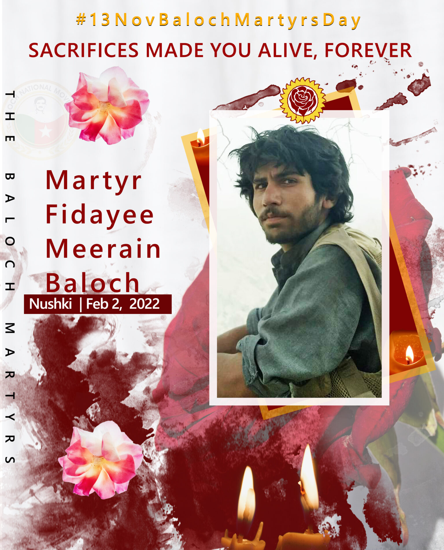 13 Nov Baloch Martyrs DayBLANushkiPostersMartyr Fidayee Meerain Baloch Last updated: November 6, 2023 8:16 am BNM Share 0 Min Read SHARE Sacrifices Made You Alive, ForeverResident of NushkiDate of martyrdom: Feb 2, 2022 Martyr Gulab Baloch Fidayee Sumaiya Baloch Martyr Rasool Jan Baloch The Legend: Martyr Nawab Akbar Khan Bugti Martyr Sir Zahid: A Source of Enlightenment TAGGED:#13NovBalochMartyrsDay#Baloch#Balochistan#BalochMartyrs#Nushki Share This Article Facebook Whatsapp Whatsapp Telegram Email Copy Link Print