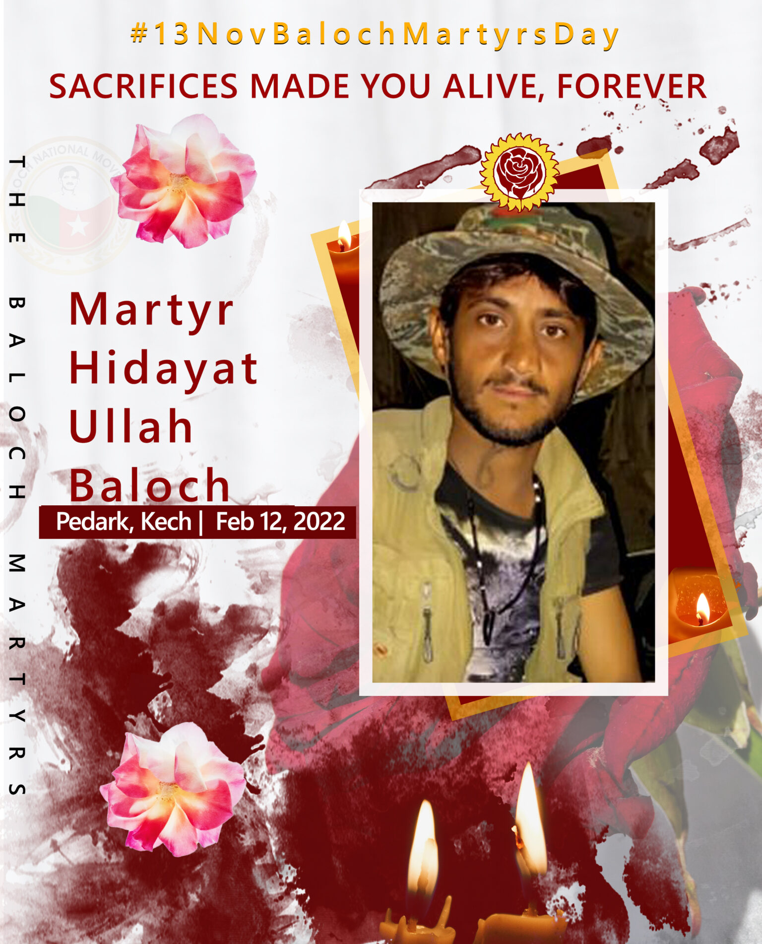 13 Nov Baloch Martyrs DayBNAKechPostersMartyr Hidayatullah Baloch Last updated: November 6, 2023 1:35 pm BNM Share 0 Min Read Hidayatullah Baloch SHARE Sacrifices Made You Alive, Forever.Resident of Peedark, KechDate of martyrdom: Feb 12, 2022 Martyr Dolat Baloch Martyr Nasir Baloch Martyr Fidayee Zameer Baloch Martyr Shakoor Baloch Poster: Martyr Kamran Baloch TAGGED:#13NovBalochMartyrsDay#Baloch#BalochMartyrs#Kech Share This Article Facebook Whatsapp Whatsapp Telegram Email Copy Link Print