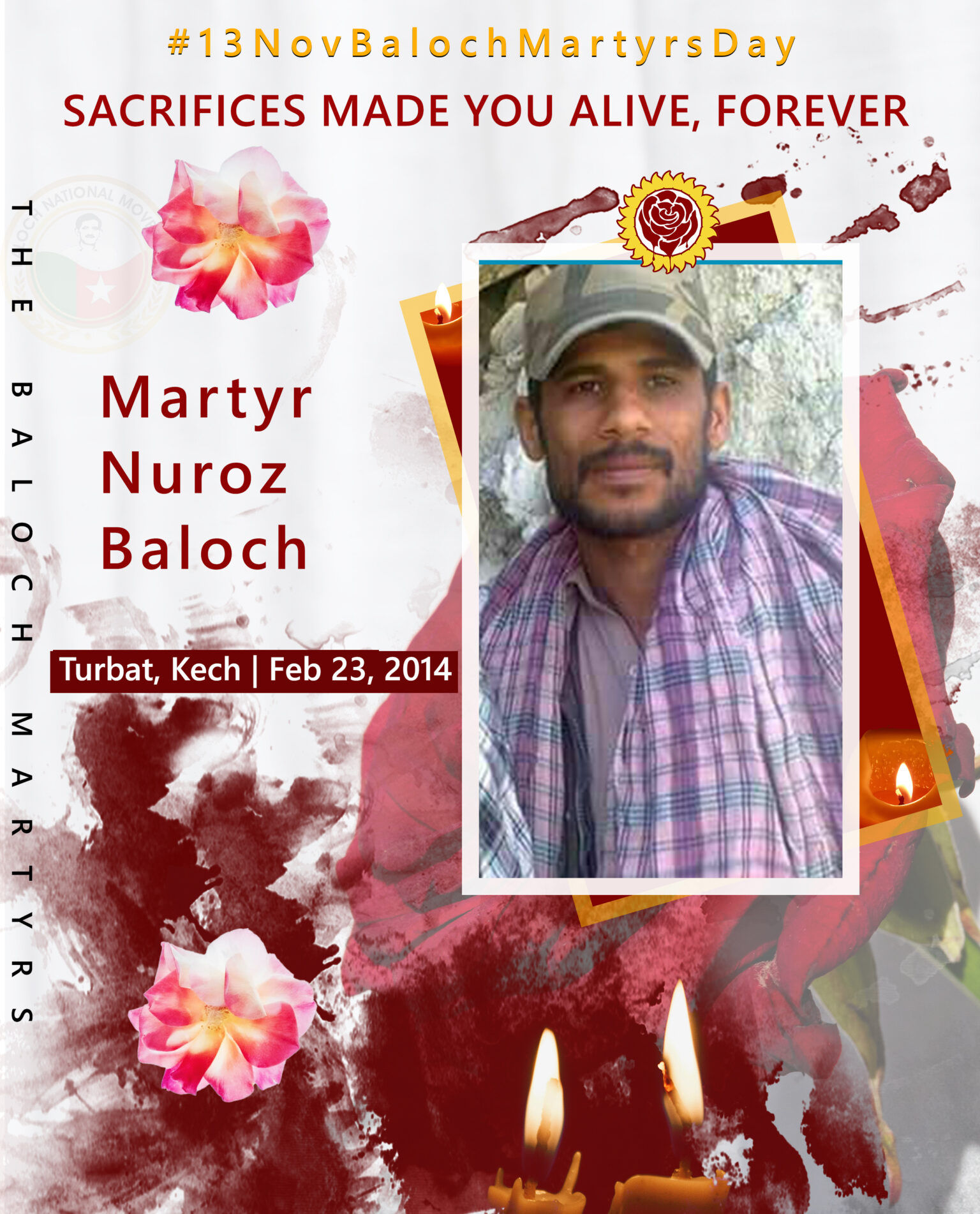 13 Nov Baloch Martyrs DayBRGFebruaryKechPostersMartyr Nuroz Baloch Last updated: November 6, 2023 2:50 pm BNM Share 0 Min Read Martyr Nuroz Baloch SHARE Sacrifices Made You Alive, Forever.Resident of Turbat, KechDate of martyrdom: Feb 23, 2014 Martyr Nawaz Baloch Martyr Fidayee Badil Baloch Brief Introduction:Zareef Baloch Martyr Mayar Baloch Martyr Khalid Hasil Baloch Share This Article Facebook Whatsapp Whatsapp Telegram Email Copy Link Print