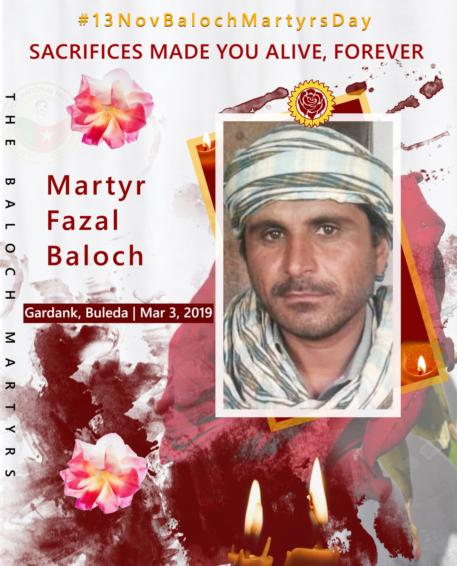 13 Nov Baloch Martyrs DayBLFKechMarchPostersMartyr Fazal Baloch Last updated: November 7, 2023 11:29 am BNM Share 0 Min Read Martyr Fazal Baloch SHARE Sacrifices Made You Alive, Forever.Resident of Gardank, Buleda, KechDate of martyrdom: March 3, 2019 Martyr Muneer Baloch Martyr Jaffar Baloch Martyr Aziz Baloch Martyr Sher Muhammad Baloch Martyr Balach Khan Baloch TAGGED:#13NovBalochMartyrsDay#Balochistan#BalochMartyrs#Kech Share This Article Facebook Whatsapp Whatsapp Telegram Email Copy Link Print