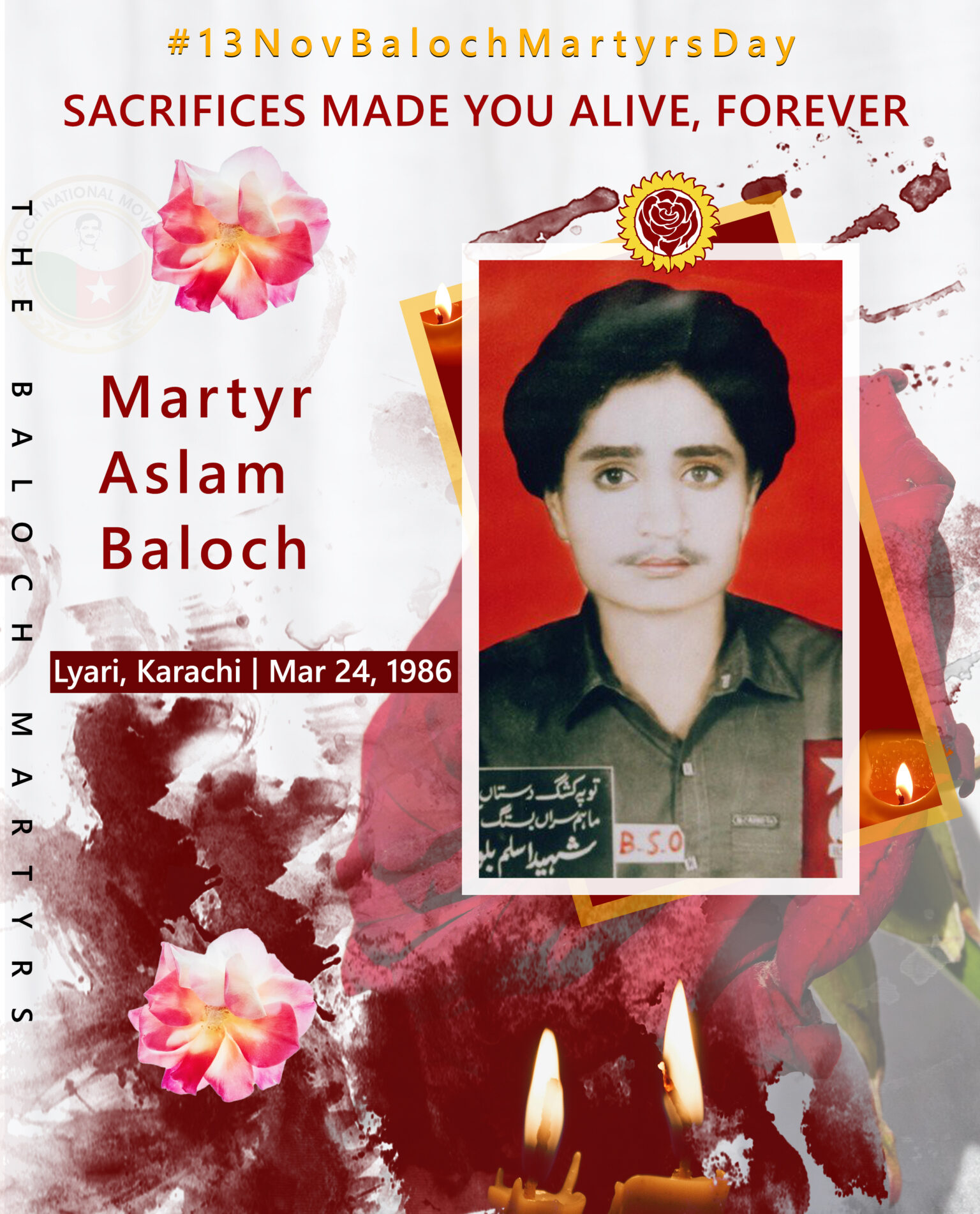 13 Nov Baloch Martyrs DayBSOKarachiMarchMartyr Aslam Baloch Last updated: November 7, 2023 12:13 pm BNM Share 0 Min Read Martyr Aslam Baloch SHARE Sacrifices Made You Alive, Forever.Resident of Kalri Sargwat, Lyari, KarachiDate of martyrdom: March 24, 1986 Martyr Hakeem Baloch Martyr Ghulam Farooq Baloch Martyr Abdul Samad Baloch Martyr Shakoor Baloch Martyr Wadood Baloch TAGGED:#13NovBalochMartyrsDay#Balochistan#BalochMartyrs#Karachi Share This Article Facebook Whatsapp Whatsapp Telegram Email Copy Link Print