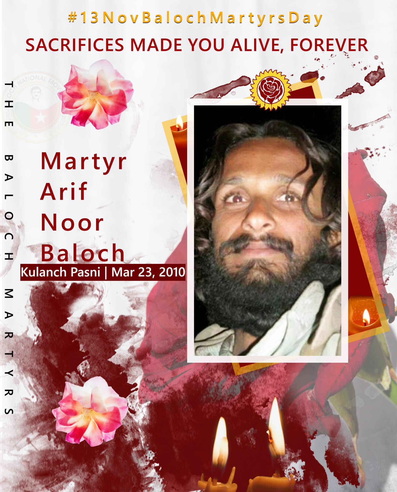 13 Nov Baloch Martyrs DayBLFGwaderMarchPostersMartyr Arif Baloch Last updated: November 7, 2023 1:17 pm BNM Share 0 Min Read Martyr Arif Baloch SHARE Sacrifices Made You Alive, ForeverResident of Kulanch, PasniDate of Martyrdom: March 23, 2010 Martyr Sharbat Baloch Martyr Fidayee Asad Wahg Baloch Martyr Shahbaz Baloch Martyr Aman Baloch Martyr Darman Baloch TAGGED:#13NovBalochMartyrsDay#Baloch#BalochMartyrs#Gwadar Share This Article Facebook Whatsapp Whatsapp Telegram Email Copy Link Print