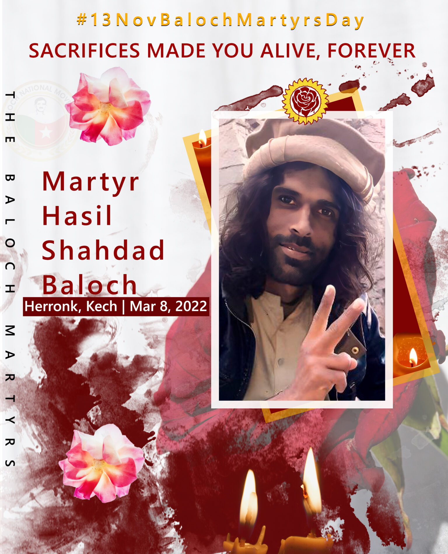 13 Nov Baloch Martyrs DayKechMarchPostersMartyr Hasil Baloch Last updated: November 7, 2023 1:33 pm BNM Share 0 Min Read Martyr Hasil Shahdad Baloch SHARE Sacrifices Made You Alive, ForeverResident of Herronk, Kech Β Date of Martyrdom: March 8, 2022 Martyr General Aslam Baloch Martyr Aman Ullah Baloch Martyr Fidayee Babar Majeed Baloch Martyr Tahir Baloch Martyrs of Sham-E-Sar TAGGED:#13NovBalochMartyrsDay#Baloch#Balochistan#BalochMartyrs#Kech Share This Article Facebook Whatsapp Whatsapp Telegram Email Copy Link Print