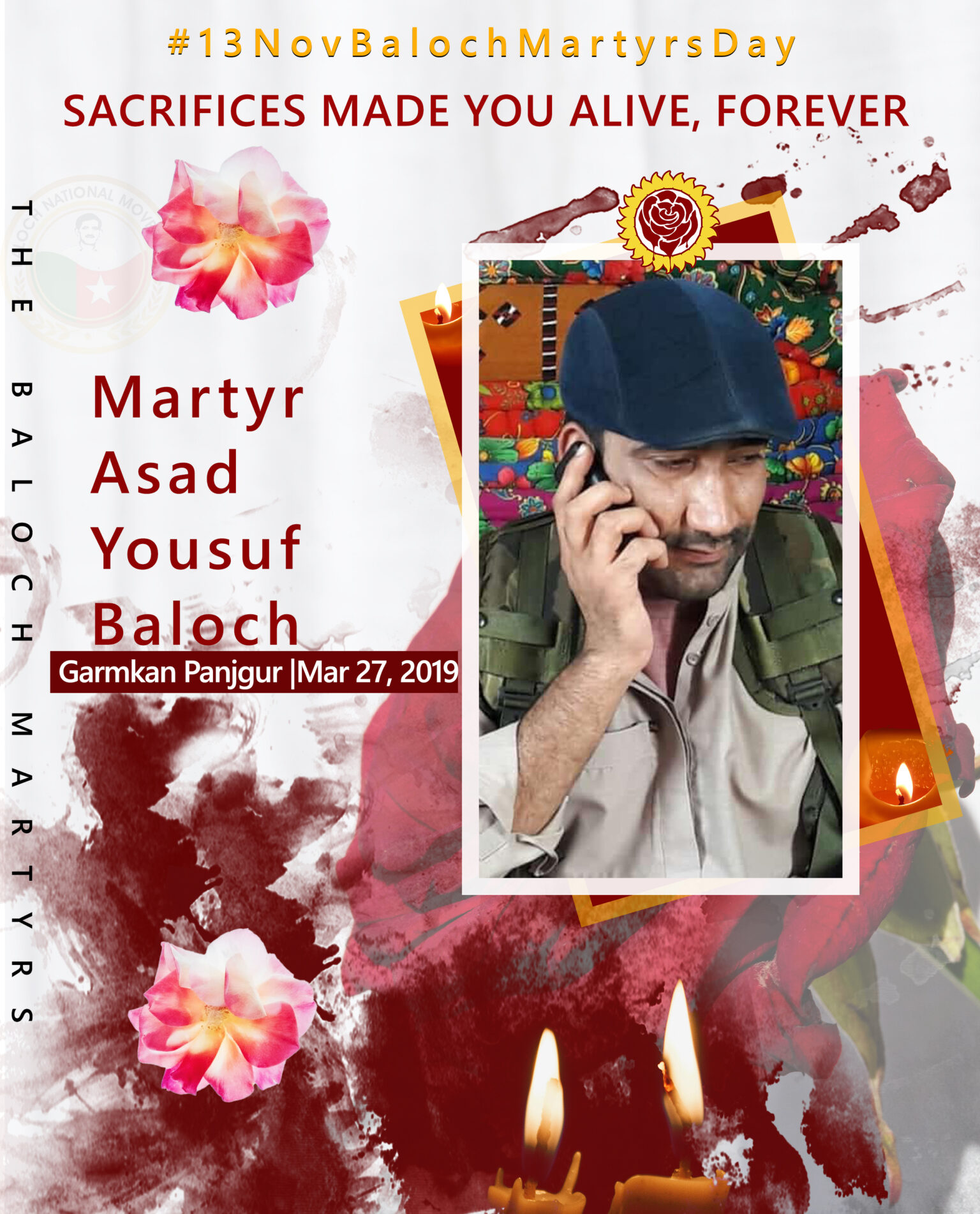 13 Nov Baloch Martyrs DayBRAMarchPanjgurPostersMartyr Asad Yousuf Baloch Last updated: November 7, 2023 3:02 pm BNM Share 0 Min Read Martyr Asad Yousuf Baloch SHARE Sacrifices Made You Alive, ForeverResident of Garmkan, PanjgurDate of Martyrdom: March 27, 2019 Martyr Sameer Baloch Martyr Arif Baloch Martyr Masood Usman Baloch Martyr Rasool Baksh Martyr Dad Muhammad Baloch TAGGED:#13NovBalochMartyrsDay#Baloch#Balochistan#BalochMartyrs#Panjgur Share This Article Facebook Whatsapp Whatsapp Telegram Email Copy Link Print