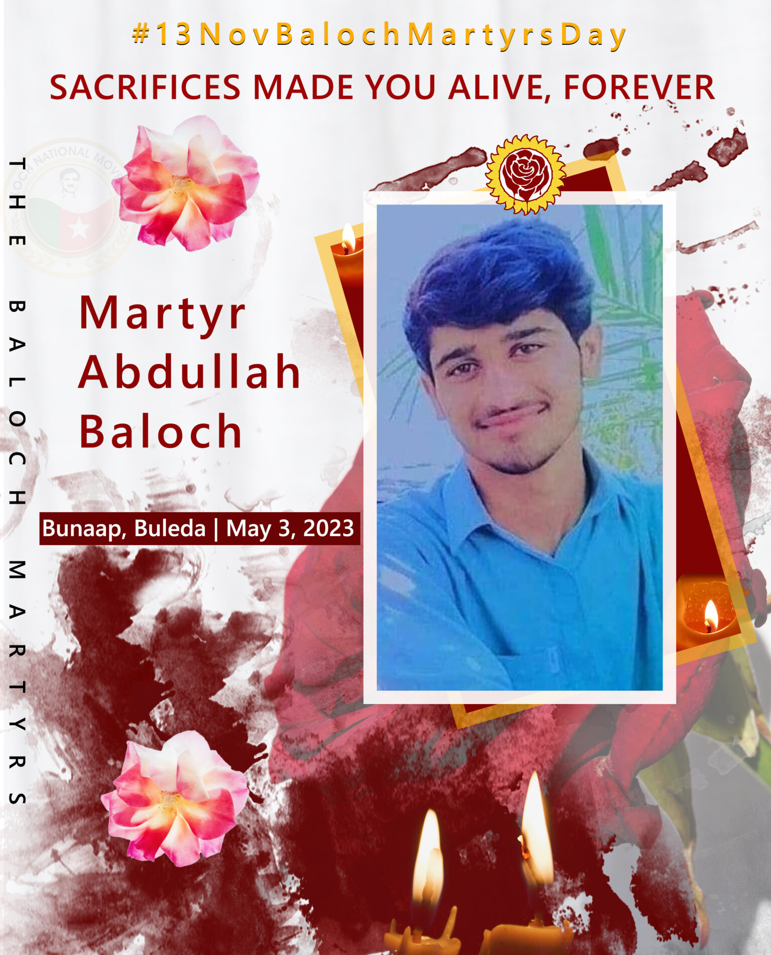 13 Nov Baloch Martyrs DayBLFKechMayPostersMartyr Abdullah Baloch Last updated: November 9, 2023 8:14 am BNM Share 0 Min Read Martyr Abdullah Baloch SHARE Sacrifices Made You Alive, Forever.Resident of Bunaap Buleda, area of KechDate of Martyrdom: April 3, 2023 BalochMartyrs: Sacrifices made you alive, forever (Series 2) Martyr Safar Khan Baloch Martyr Adnan Baloch Martyr Mubasher Baloch Martyr Hamid Baloch TAGGED:#13NovBalochMartyrsDay#Baloch#Balochistan#BalochMartyrs#Kech Share This Article Facebook Whatsapp Whatsapp Telegram Email Copy Link Print Leave a Comment Leave a Comment Leave a ReplyYour email address will not be published. Required fields are marked *Comment *Name Email Website Δ