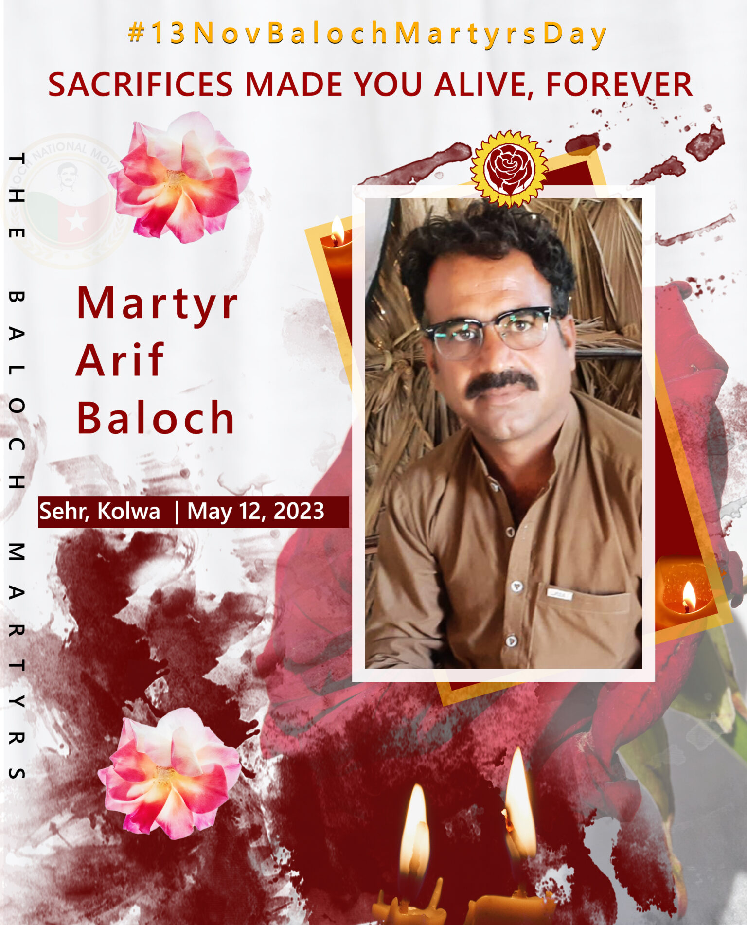 13 Nov Baloch Martyrs DayBLFKechMayPostersMartyr Arif Baloch Last updated: November 9, 2023 8:27 am BNM Share 0 Min Read Martyr Arif Baloch SHARE Sacrifices Made You Alive, Forever.Resident of Sehr Kolwa, area of KechDate of Martyrdom: April 12, 2023 Martyr Zaman Baloch Martyr Fidayee Hamid Baloch Martyr Fahad Shah Baloch Martyr Abdul Rauf Baloch BalochMartyrs: Sacrifices made you alive, forever (Series 1) TAGGED:#13NovBalochMartyrsDay#Baloch#Balochistan#BalochMartyrs#Kech Share This Article Facebook Whatsapp Whatsapp Telegram Email Copy Link Print Leave a Comment Leave a Comment Leave a ReplyYour email address will not be published. Required fields are marked *Comment *Name Email Website Δ