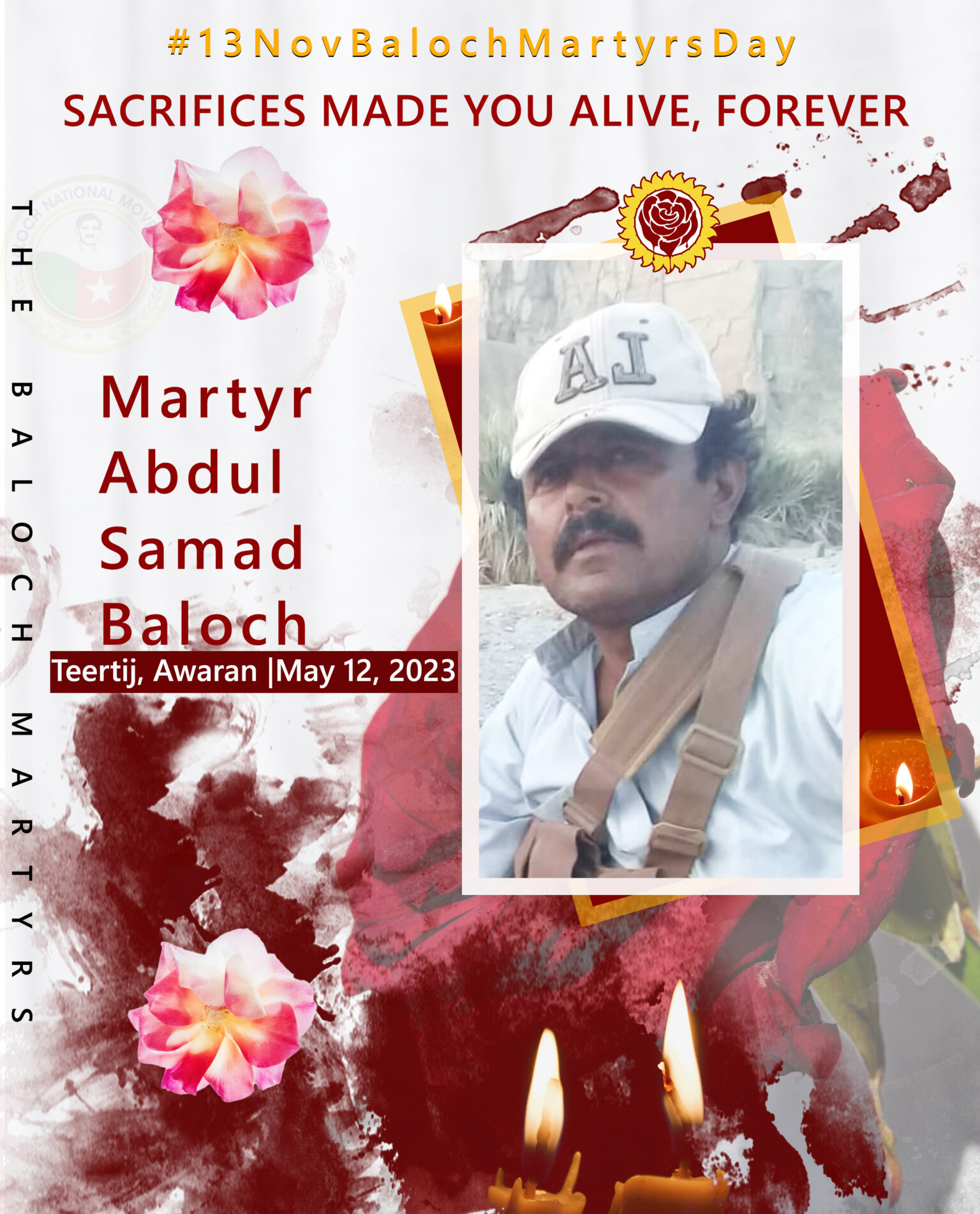 13 Nov Baloch Martyrs DayAwaranBLFMayPostersMartyr Abdul Samad Baloch Last updated: November 9, 2023 8:32 am BNM Share 0 Min Read Martyr Abdul Samad Baloch SHARE Sacrifices Made You Alive, Forever.Resident of Teertij, area of AwaranDate of Martyrdom: April 12, 2023 Brief Introduction: Rashid Baloch Martyr Meeshdar Baloch Martyr Najid Dil Murad Martyr Fidayee Badil Baloch Martyr Murad Jan Baloch TAGGED:#13NovBalochMartyrsDay#Awaran#Baloch#Balochistan#BalochMartyrs Share This Article Facebook Whatsapp Whatsapp Telegram Email Copy Link Print Leave a Comment Leave a Comment Leave a ReplyYour email address will not be published. Required fields are marked *Comment *Name Email Website Δ