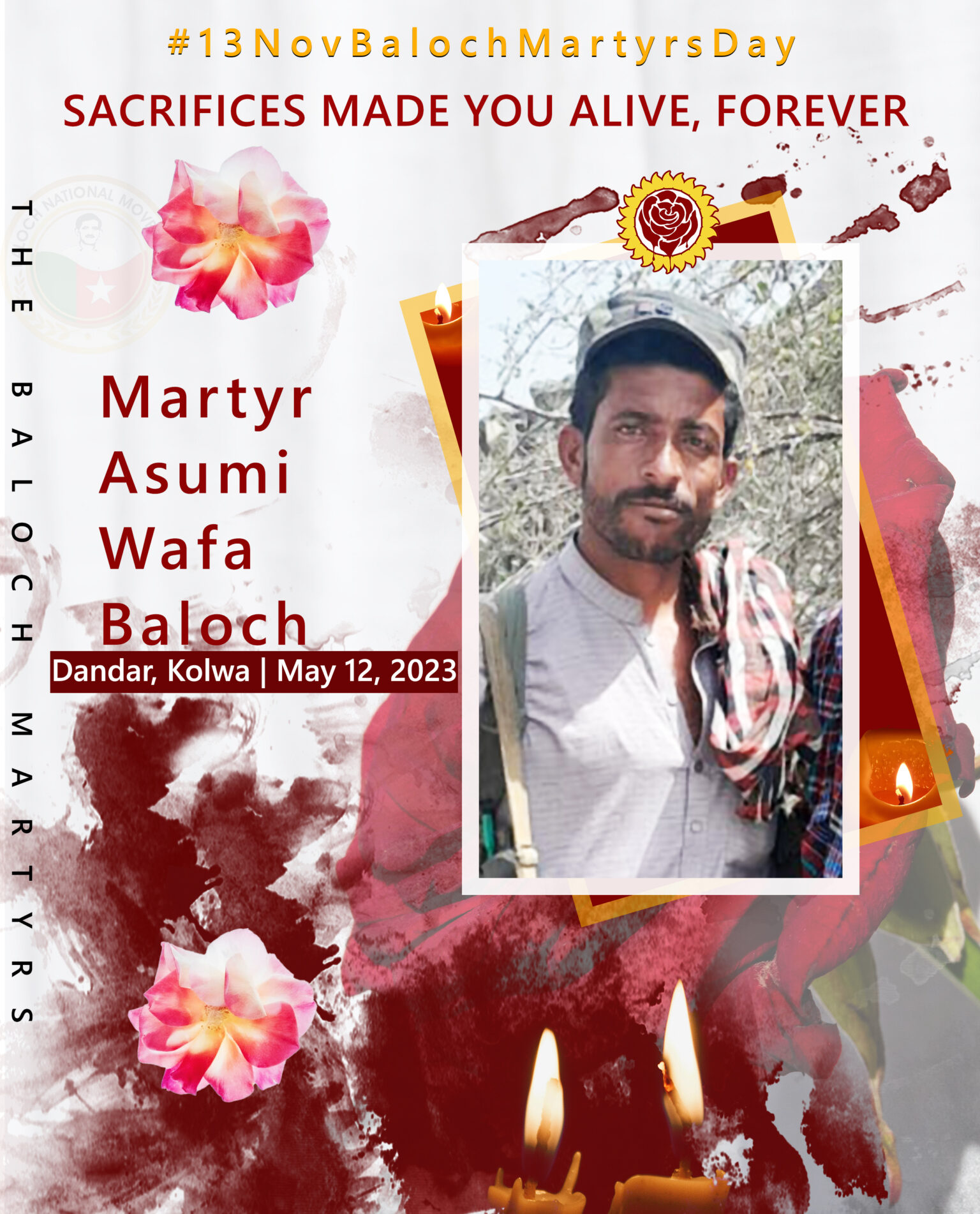 13 Nov Baloch Martyrs DayBLFKechMayPostersMartyr Asumi Wafa Baloch Last updated: November 9, 2023 8:36 am BNM Share 0 Min Read Martyr Asumi Wafa Baloch SHARE Sacrifices Made You Alive, Forever.Resident of Dandar Kolwa, area of KechDate of Martyrdom: April 12, 2023 Martyr Dolat Baloch Martyr Ustad Mukhtar Baloch Martyr Hidayatullah Baloch Brief Introduction: Chakar Ghulam Qadir Martyr Dosten Baloch TAGGED:#13NovBalochMartyrsDay#Baloch#Balochistan#BalochMartyrs#Kech Share This Article Facebook Whatsapp Whatsapp Telegram Email Copy Link Print Leave a Comment Leave a Comment Leave a ReplyYour email address will not be published. Required fields are marked *Comment *Name Email Website Δ