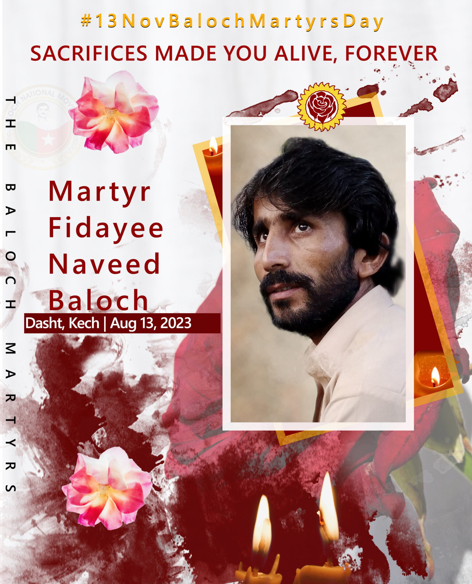 13 Nov Baloch Martyrs DayAugustBLAFedayeenKechPostersMartyr Fidayee Naveed Baloch Last updated: November 10, 2023 10:03 am BNM Share 0 Min Read Martyr Naveed Baloch SHARE Sacrifices Made You Alive, Forever.Resident of Dasht area of KechDate of Martyrdom: Aug 13, 2023 Martyr Sameer Baloch Martyr Jaffar Baloch Martyr Javid Baloch Martyr Fidayee Deedag Bahr Baloch Martyr Mubasher Baloch TAGGED:#13NovBalochMartyrsDay#Baloch#Balochistan#BalochMartyrs#Kech Share This Article Facebook Whatsapp Whatsapp Telegram Email Copy Link Print Leave a Comment Leave a Comment Leave a ReplyYour email address will not be published. Required fields are marked *Comment *Name Email Website Δ