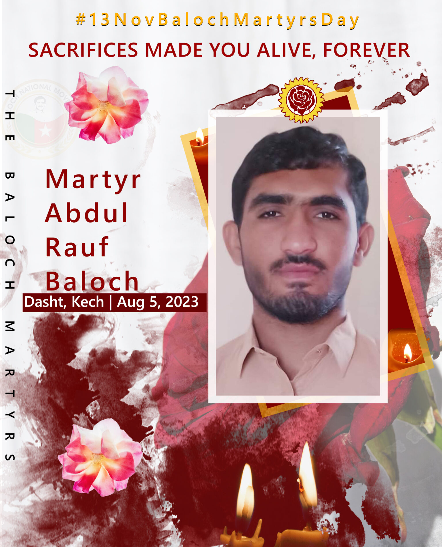 13 Nov Baloch Martyrs DayAugustKechPostersMartyr Abdul Rauf Baloch Last updated: November 10, 2023 2:59 pm BNM Share 0 Min Read Martyr Abdul Rauf Baloch SHARE Sacrifices Made You Alive, Forever.Resident of Dasht area of KechDate of Martyrdom: Aug 5, 2023 Martyr Sami Ullah Baloch Martyr Nuroz Baloch Martyr Nasir Baloch Martyr Bahot Abid Baloch Martyr Dr. Mannan Baloch TAGGED:#13NovBalochMartyrsDay#Baloch#Balochistan#BalochMartyrs#Kech Share This Article Facebook Whatsapp Whatsapp Telegram Email Copy Link Print Leave a Comment Leave a Comment Leave a ReplyYour email address will not be published. Required fields are marked *Comment *Name Email Website Δ