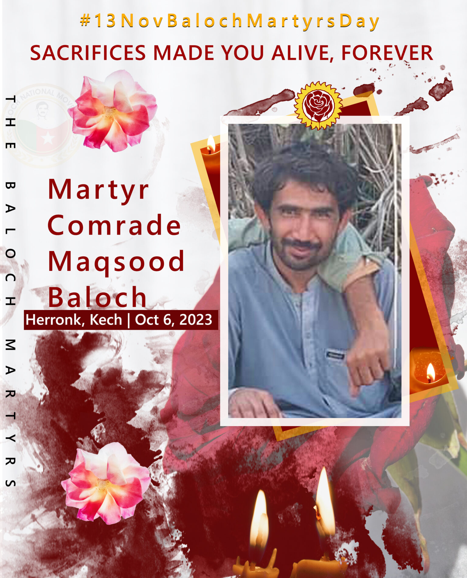 Martyr Comrade Maqsood alias Comrade Mehrwan Baloch, son of Ahmed and was a resident of Herronk, area of Kech Balochistan. He started his students politics in platform of BSO Azad and he was known as a dedicated and active comrade. After years in 2012, he joined the Baloch armed struggle in the platform of the Balochistan Liberation Front (BLF). Later in 2015, he joined Baloch Liberation Army (BLA).