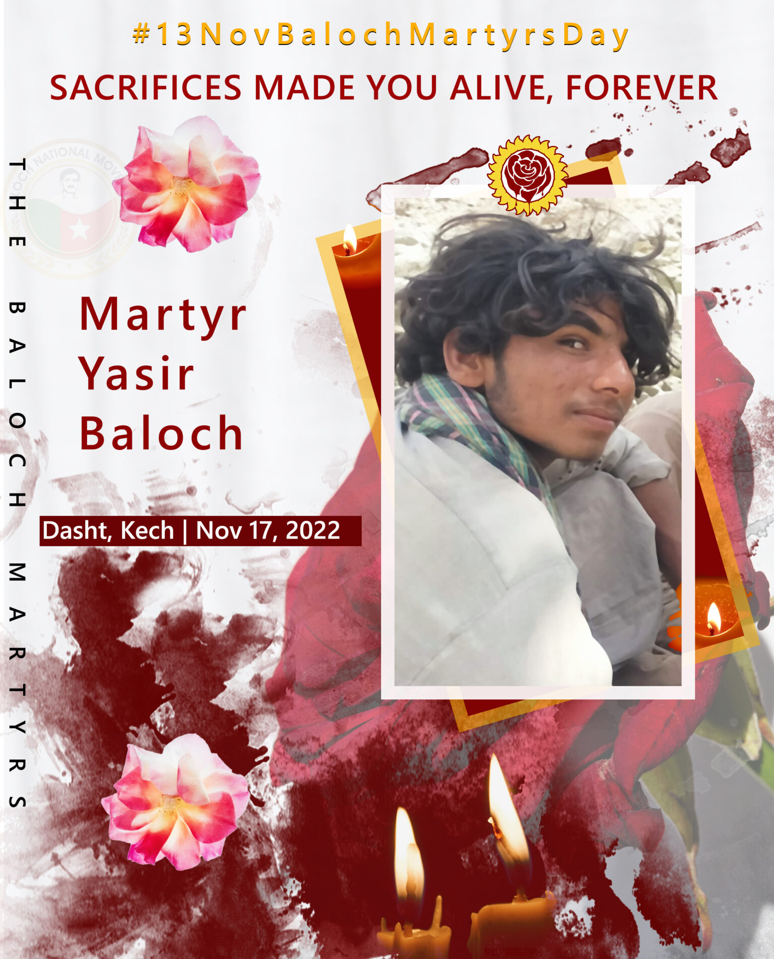 Martyr Yasir Baloch Alias Meeral Baloch , Son of Wahid Baloch and was a resident Gawrag Bag Dasht, area of Kech, Balochistan. He became part of liberation movement in platform of Baloch Republican Army (BRA) in 2020 and he newly joined in a pro-independence organization, Baloch Liberation Army BLA. He embraced martyrdom along with his a comrade, Zahid  during a clash with Pakistan Army  on Nov 17, 2022 in Balor, Kolwa area of Kech, Balochistan.