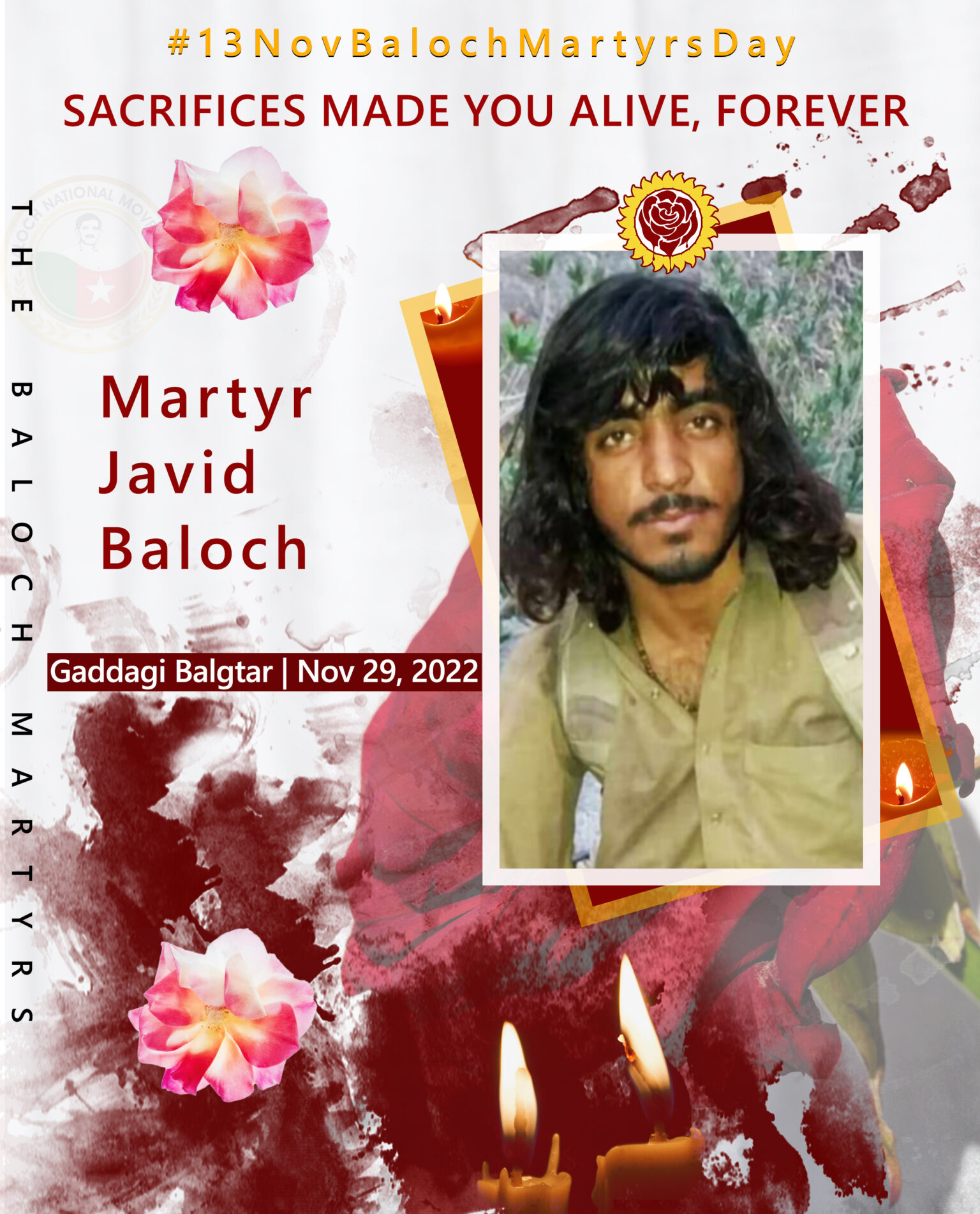 Martyr Javid Baloch, son of  Muhammad Usman Baloch and was a resident of Gaddagi, Balgtar, area of Panjgur, Balochistan. He became part of Baloch liberation movement in platform of Baloch Republican Army (BRA) in 2013. He newly joined in Baloch Liberation Army (BLA) before same days of his martyrdom. He embraced martyrdom along with eight comrades, Jalil Sher Baloch, Samad Baloch, Dad Shah, Kambar Baloch, Shoaib Baloch, Rahmdil Baloch, Haris Baloch and Nawaz Baloch  in a drone attack of Pakistan Army  on Nov 29, 2022 in Jath, Kolwa area of Kech, Balochistan.
