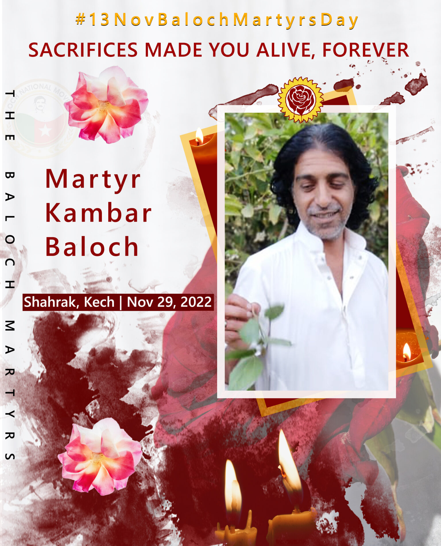 Martyr Kambar Baloch alias Sagaar Baloch was born in house of Muhammad Kareem Baloch and in Shahrak area of Kech, Balochistan. He became part of Baloch liberation movement in platform of Balochistan Liberation Front BLF in 2014. He newly joined in Baloch Liberation Army (BLA) before same days of his martyrdom. He embraced martyrdom along with eight comrades, Jalil Sher Baloch, Samad Baloch, Dad Shah, Samad Baloch, Shoaib Baloch, Rahmdil Baloch, Haris Baloch and Nawaz Baloch  in a drone attack of Pakistan Army  on Nov 29, 2022 in Jath, Kolwa area of Kech, Balochistan.   Â