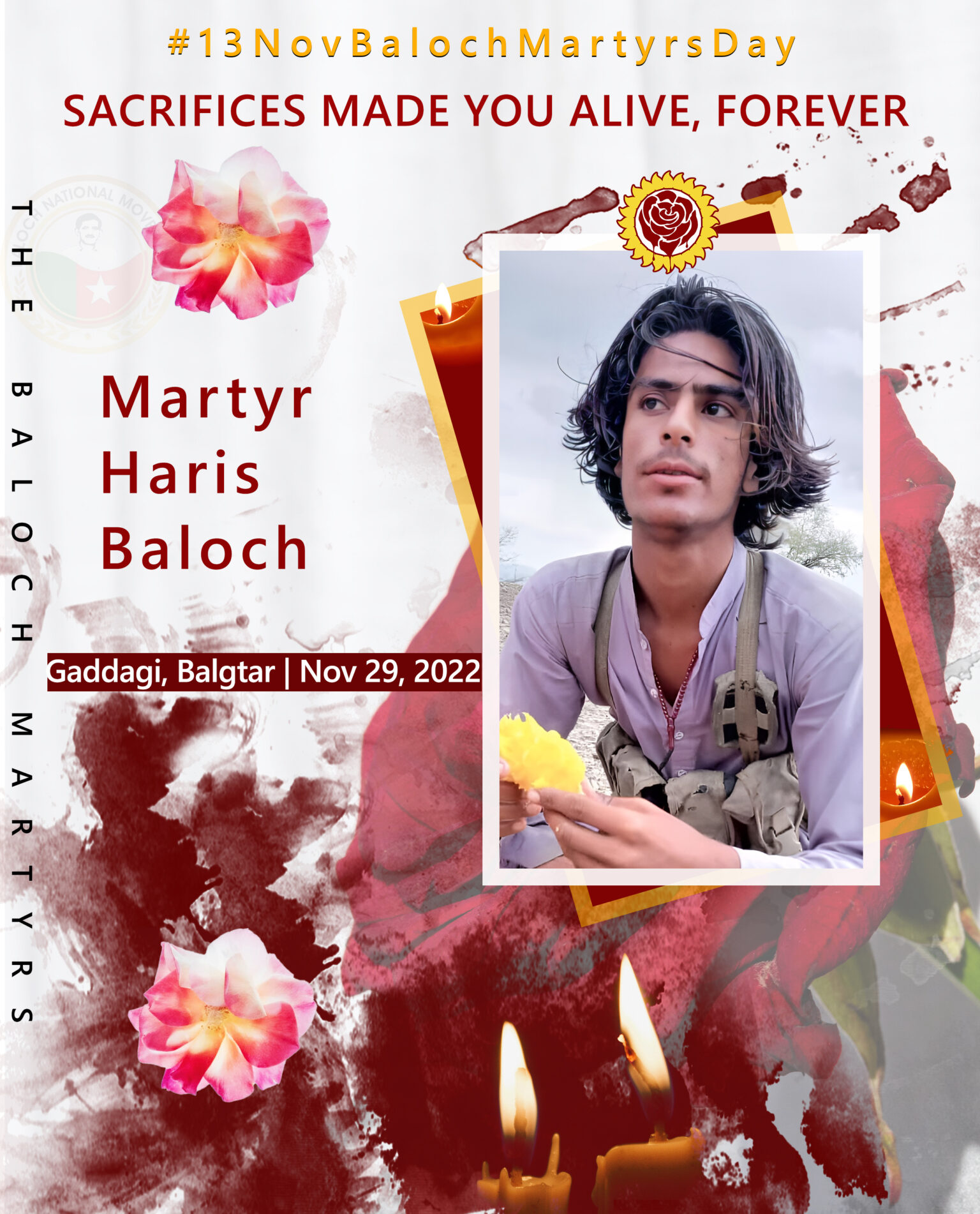 Martyr Haris Baloch Alias Sawad Baloch was born in house of Ghulam Ali in Gaddagi, Balgtar area of Panjgur, Balochistan. He affiliated with Baloch Liberation Army, BLA since 2019. He embraced martyrdom along with eight comrades, Jalil Sher Baloch, Samad Baloch, Dad Shah, Samad Baloch, Shoaib Baloch, Rahmdil Baloch, Nawaz Baloch and Kambar Baloch  in a drone attack of Pakistan Army  on Nov 29, 2022 in Jath, Kolwa area of Kech, Balochistan.  Â