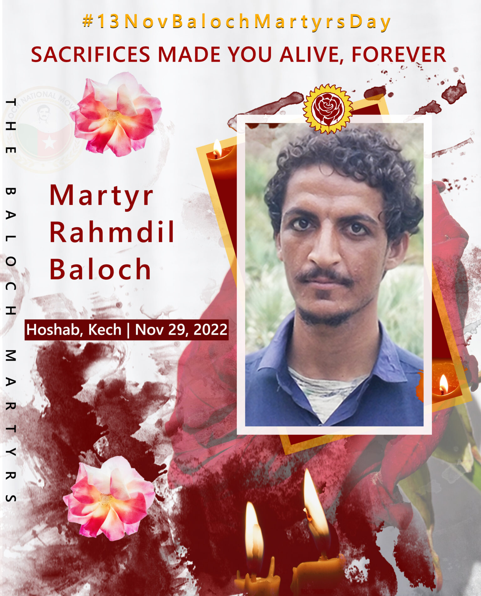 Martyr Rahmdil Baloch alias Wahid Baloch was born in house of Wahab Baloch in Hoshab area of Kech, Balochistan.  He affiliated with Baloch Liberation Army, BLA since 2021. He embraced martyrdom along with eight comrades, Jalil Sher Baloch, Samad Baloch, Dad Shah, Samad Baloch, Shoaib Baloch, Haris Baloch, Nawaz Baloch and Kambar Baloch  in a drone attack of Pakistan Army  on Nov 29, 2022 in Jath, Kolwa area of Kech, Balochistan.   Â