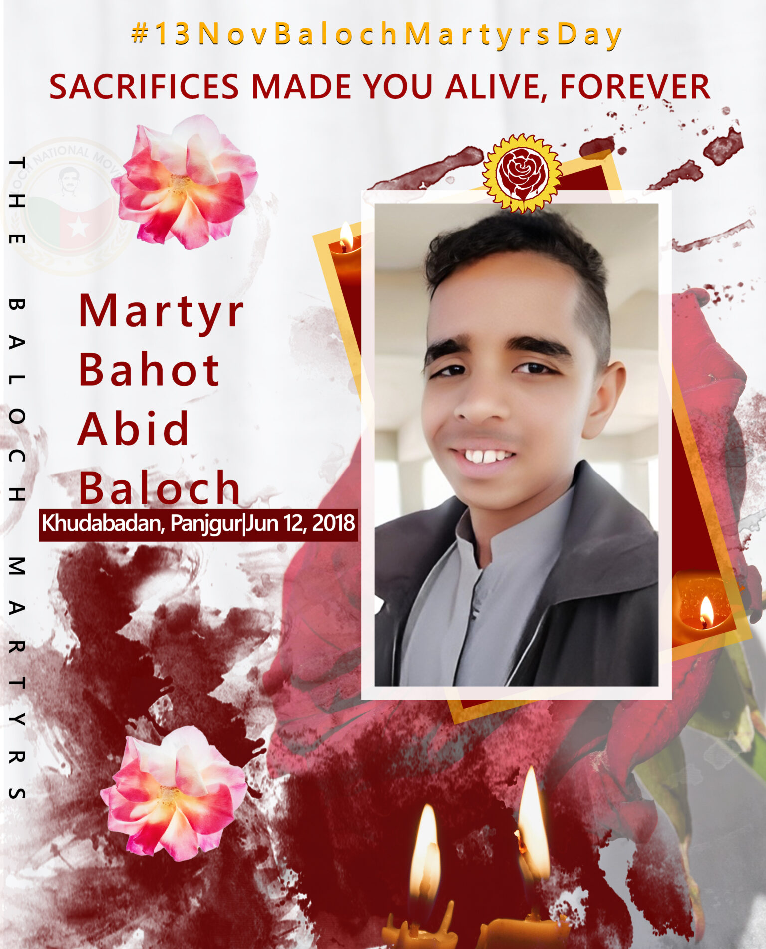 13 Nov Baloch Martyrs DayJunePanjgurPostersMartyr Bahot Abid Baloch Last updated: November 11, 2023 3:10 pm BNM Share 0 Min Read Martyr Bahot Abid Baloch SHARE Sacrifices Made You Alive, Forever.Resident of Khudabadan area of PanjgurDate of martyrdom: June 12, 2018 BalochMartyrs: Sacrifices made you alive, forever (Series 5) Martyr Arif Baloch Martyr Shoaib Baloch Martyr Nasir Baloch Martyrs Of Kharan, Imran Baloch | Aamir Baloch TAGGED:#13NovBalochMartyrsDay#Balochistan#BalochMartyrs#Panjgur Share This Article Facebook Whatsapp Whatsapp Telegram Email Copy Link Print Leave a Comment Leave a Comment Leave a ReplyYour email address will not be published. Required fields are marked *Comment *Name Email Website Δ
